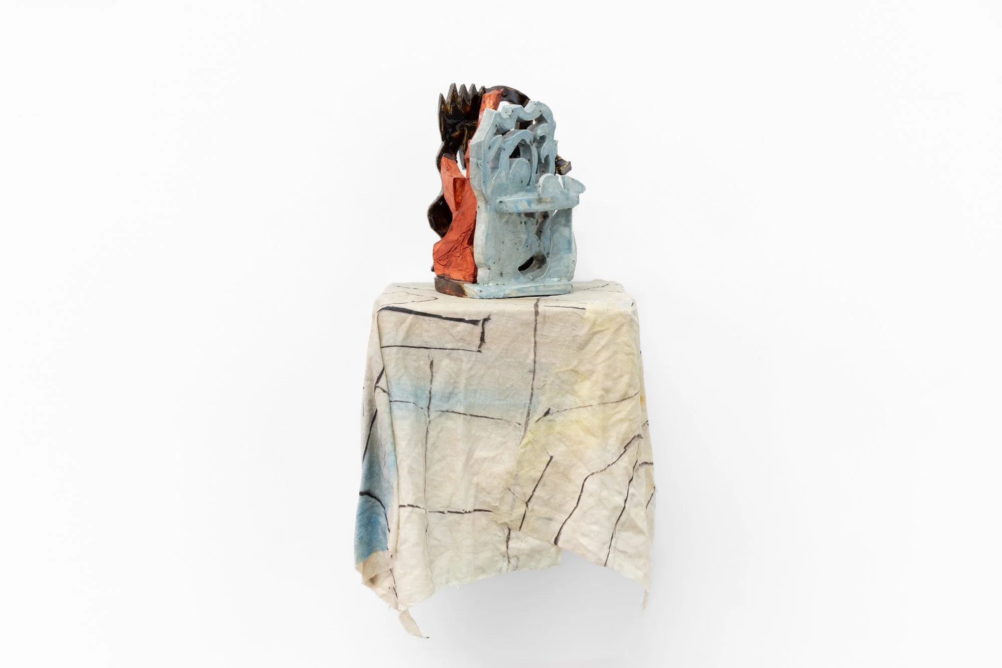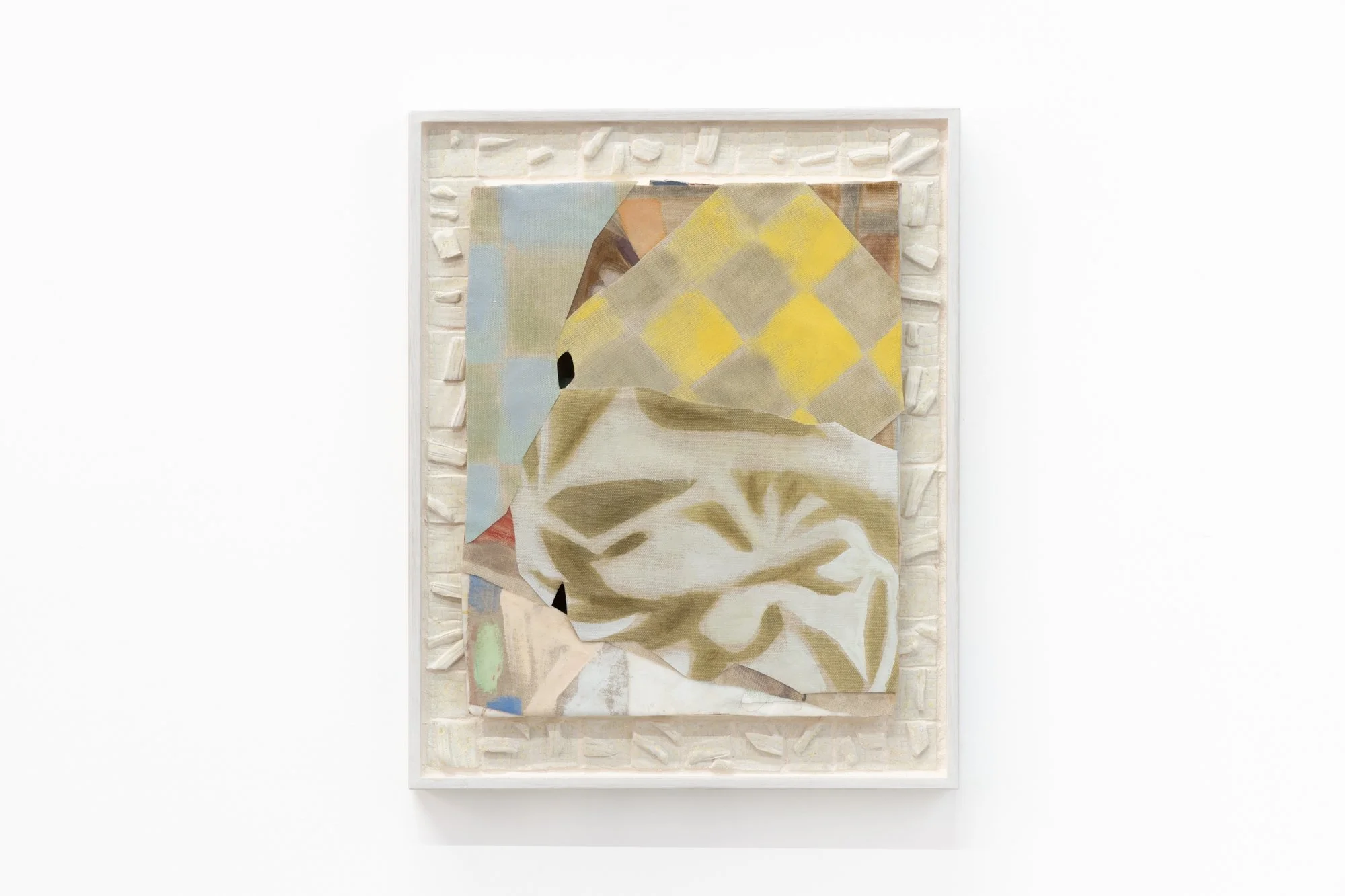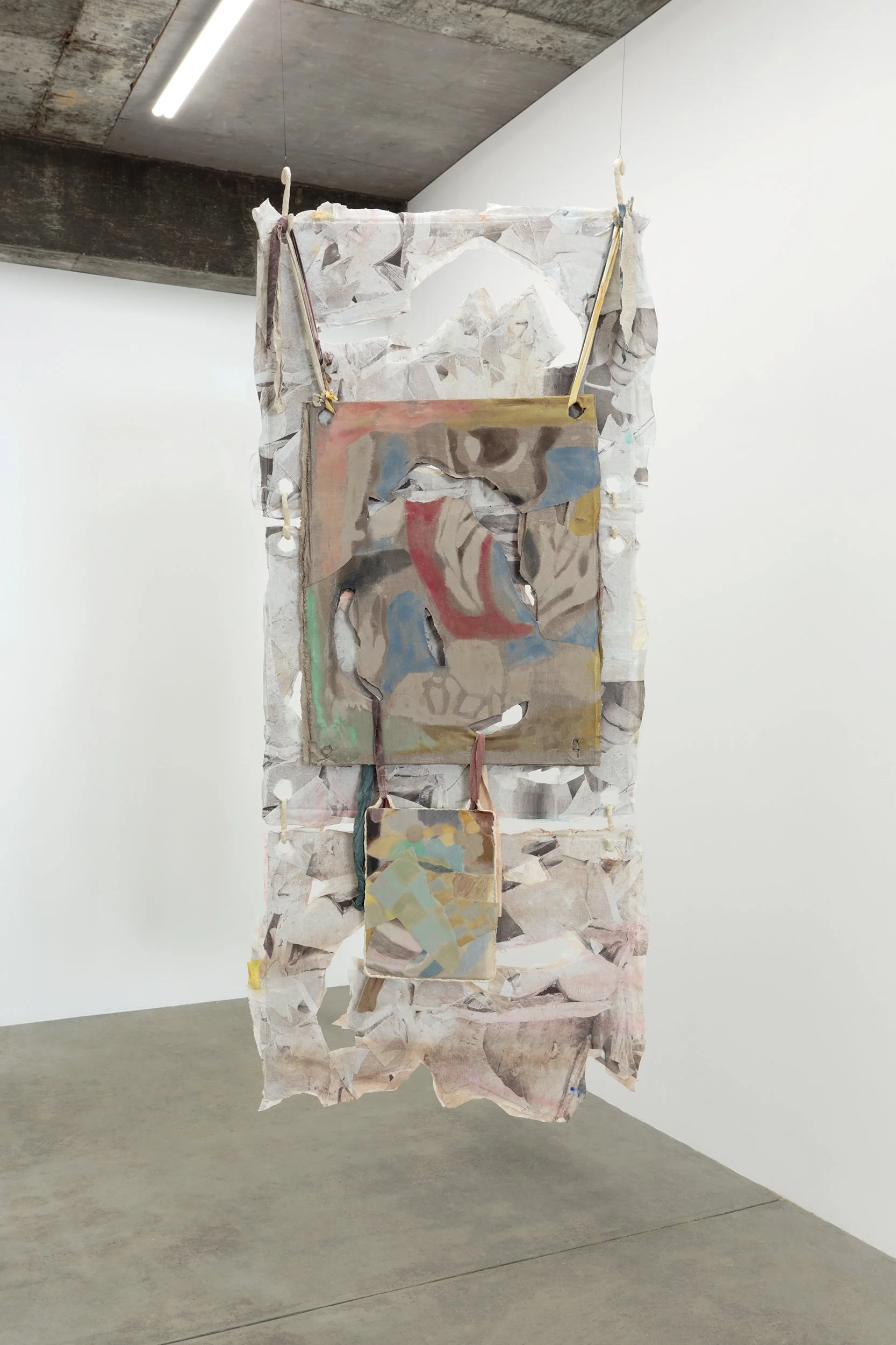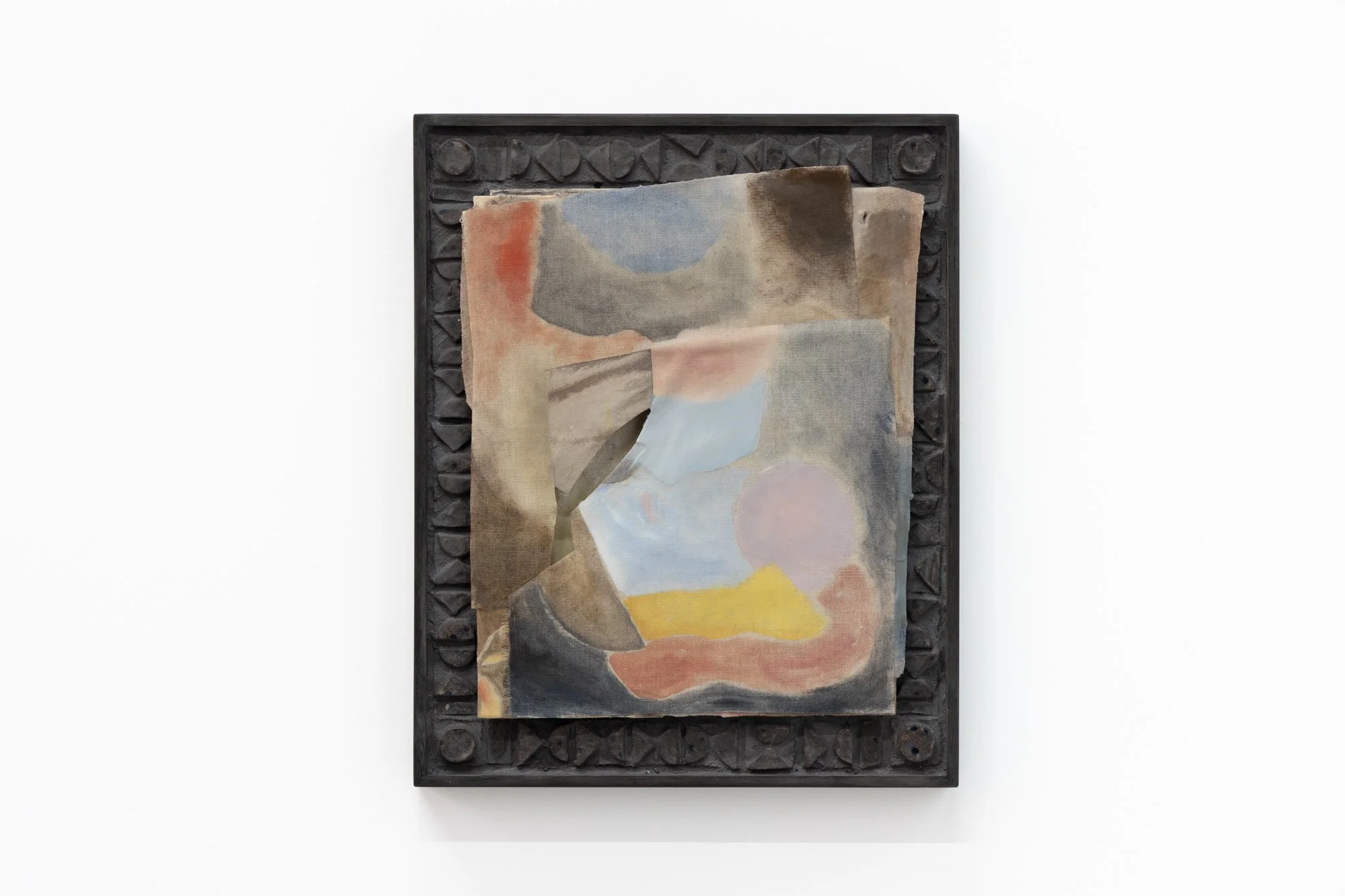 This new body of works furthers Tucker’s experiments with aggregation and layering of clay, paint, textiles and steel—making, fracturing and recombining material elements in a manner that subverts expected orders. Her process emerged from a desire to rethink the material processes of traditional painting onto flat, pre-stretched linens. Rather than working to create a picture within a defined area and surface, each angle and layer of Tucker’s artworks is treated as an explorative process that morphs the form and sensibility of the work. The result is an accumulation of physical and pictorial impressions, where familiar traits of painting and sculpture are swapped, shared, and re-discovered through clusters of colour and material.
