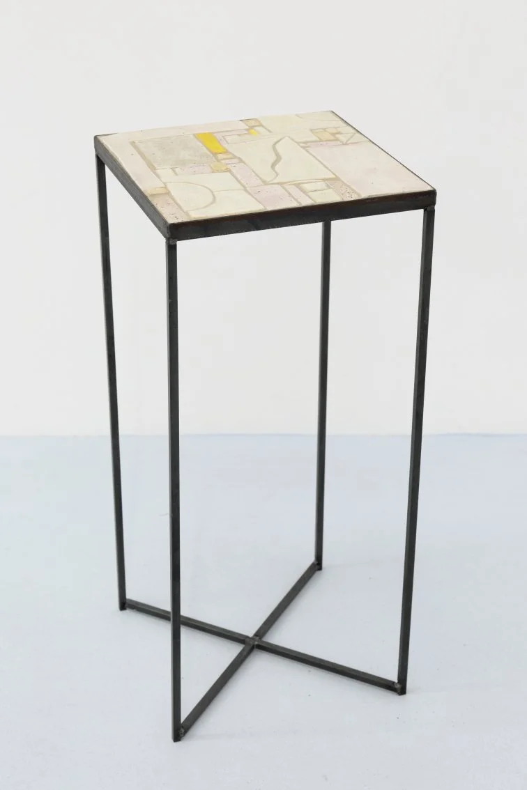 Ceramic bases hold and support the paintings, with the content of each painting informed by the structure of its base. A third support structure has been added to this body of work, with the introduction of Tucker’s ‘Elevations’, a series of steel plinths each topped with tiled and interlocking hand-built ceramic forms.