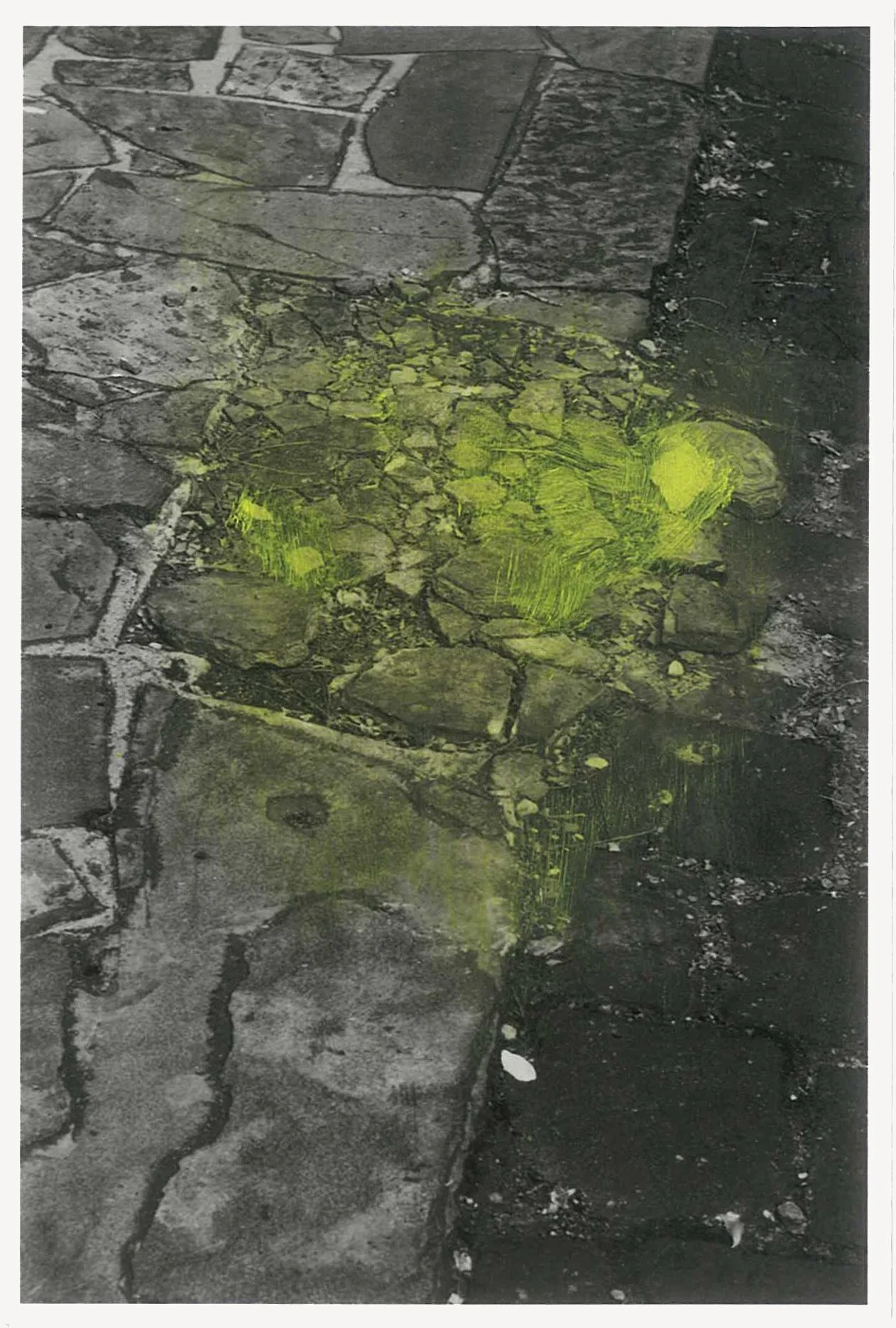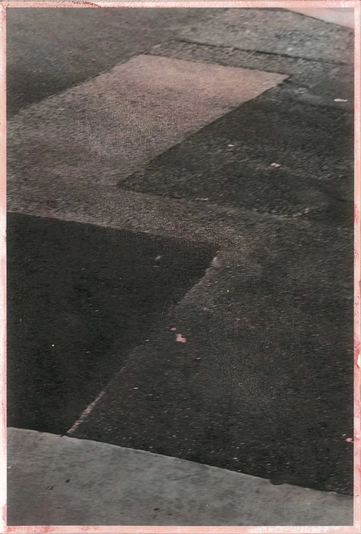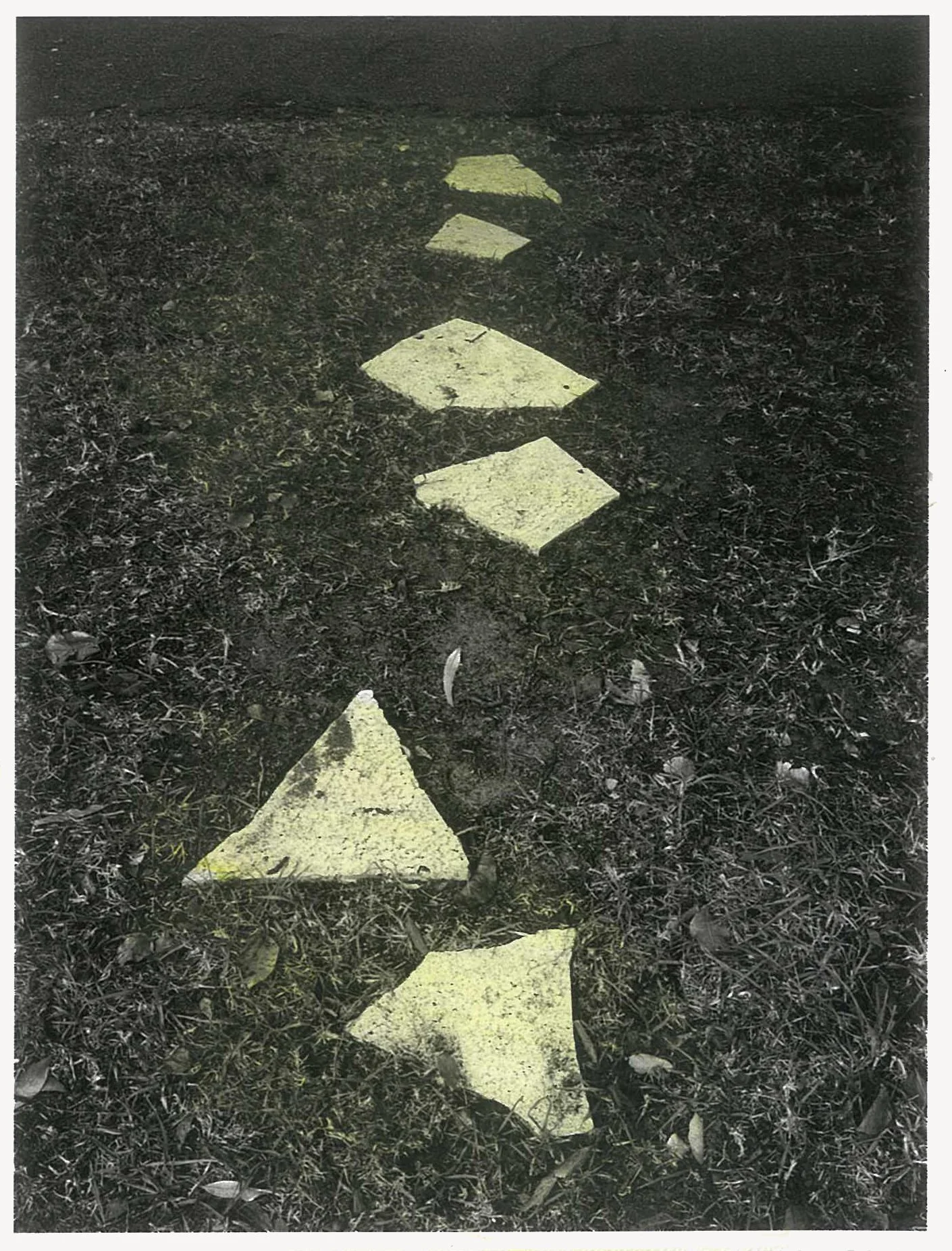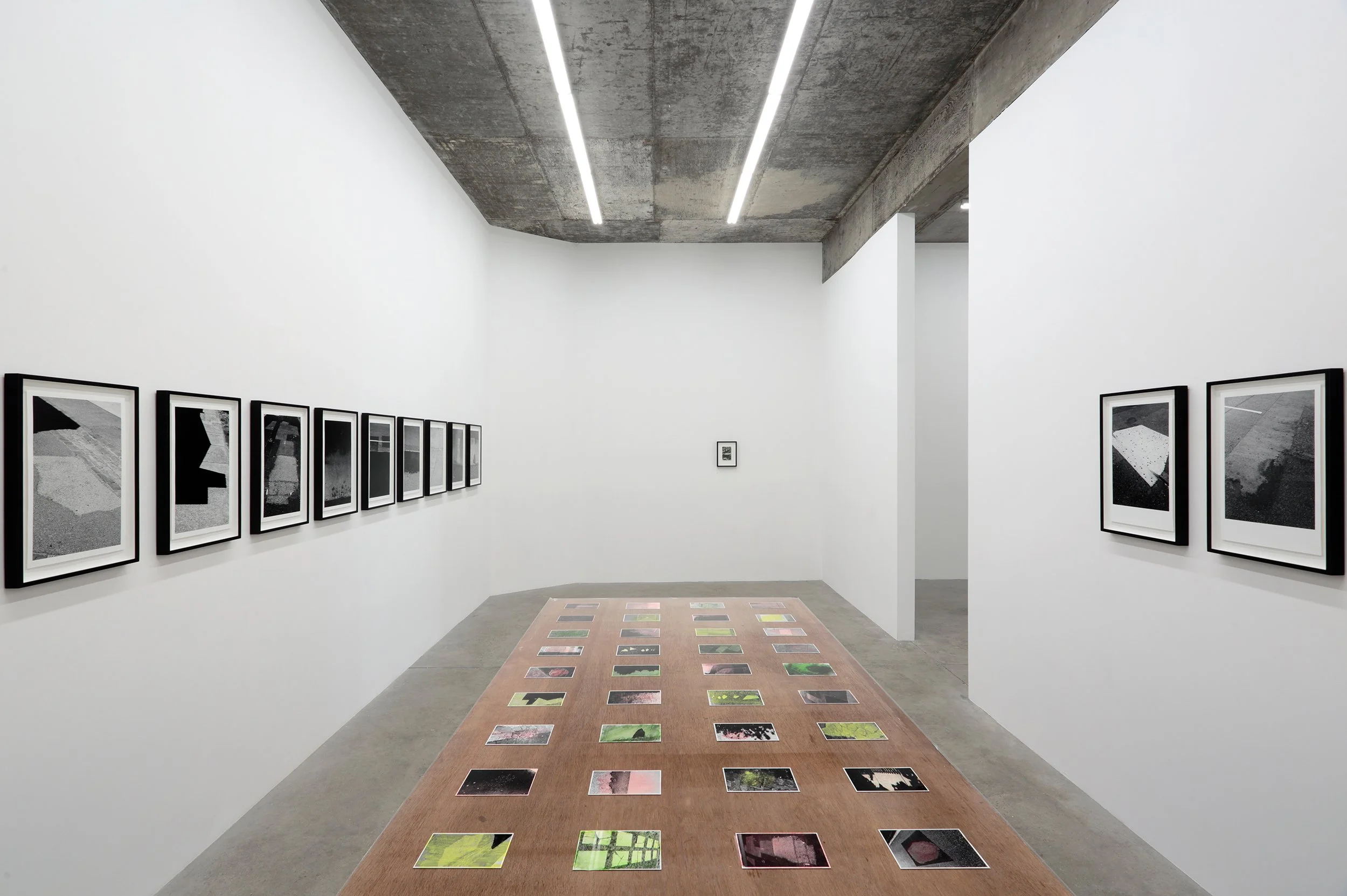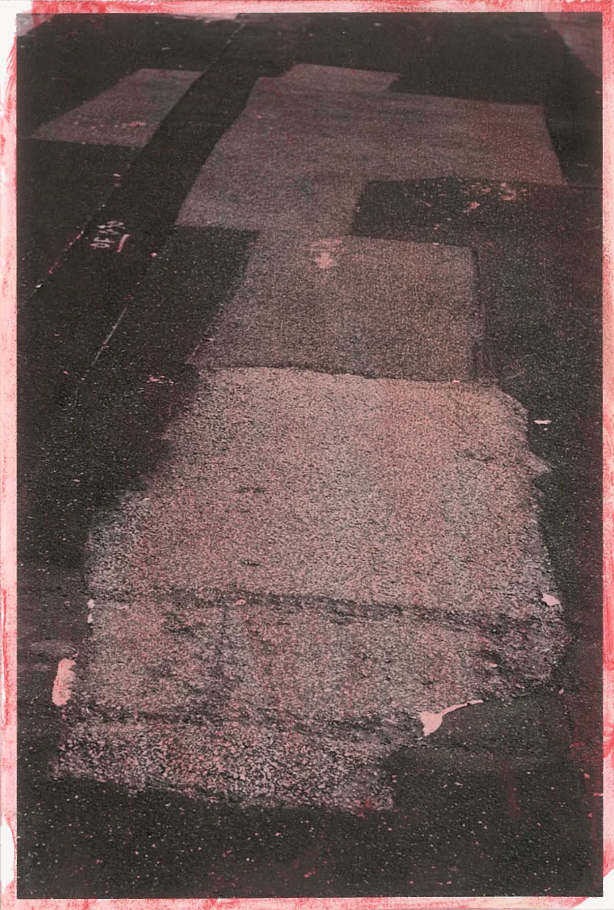 The semi-abstracted photographs in Footpaths catalogue details of pedestrian walkways around Naarm/Melbourne. Seemingly ubiquitous, odd grids and lines of concrete, bitumen, gravel and bluestone are re-encountered and scrutinised as a taxonomy of highly nuanced variations of pattern, material and composition. The montage-like grouping of footpath details across both black and white and hand-coloured photographic prints accentuate encounters and phenomenological experience with details of the material world.