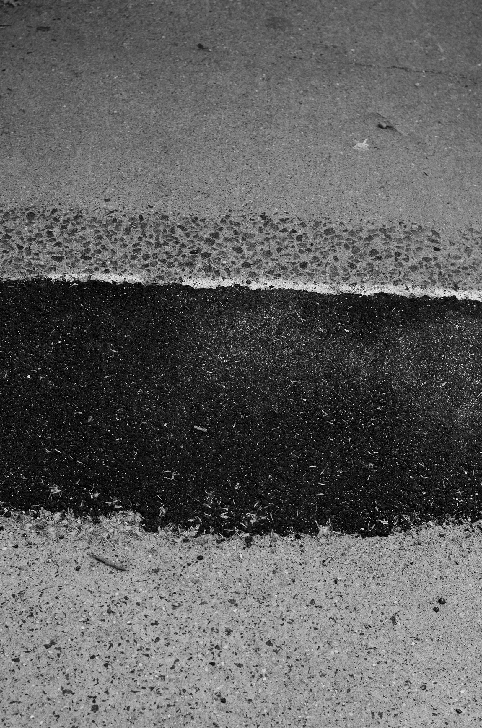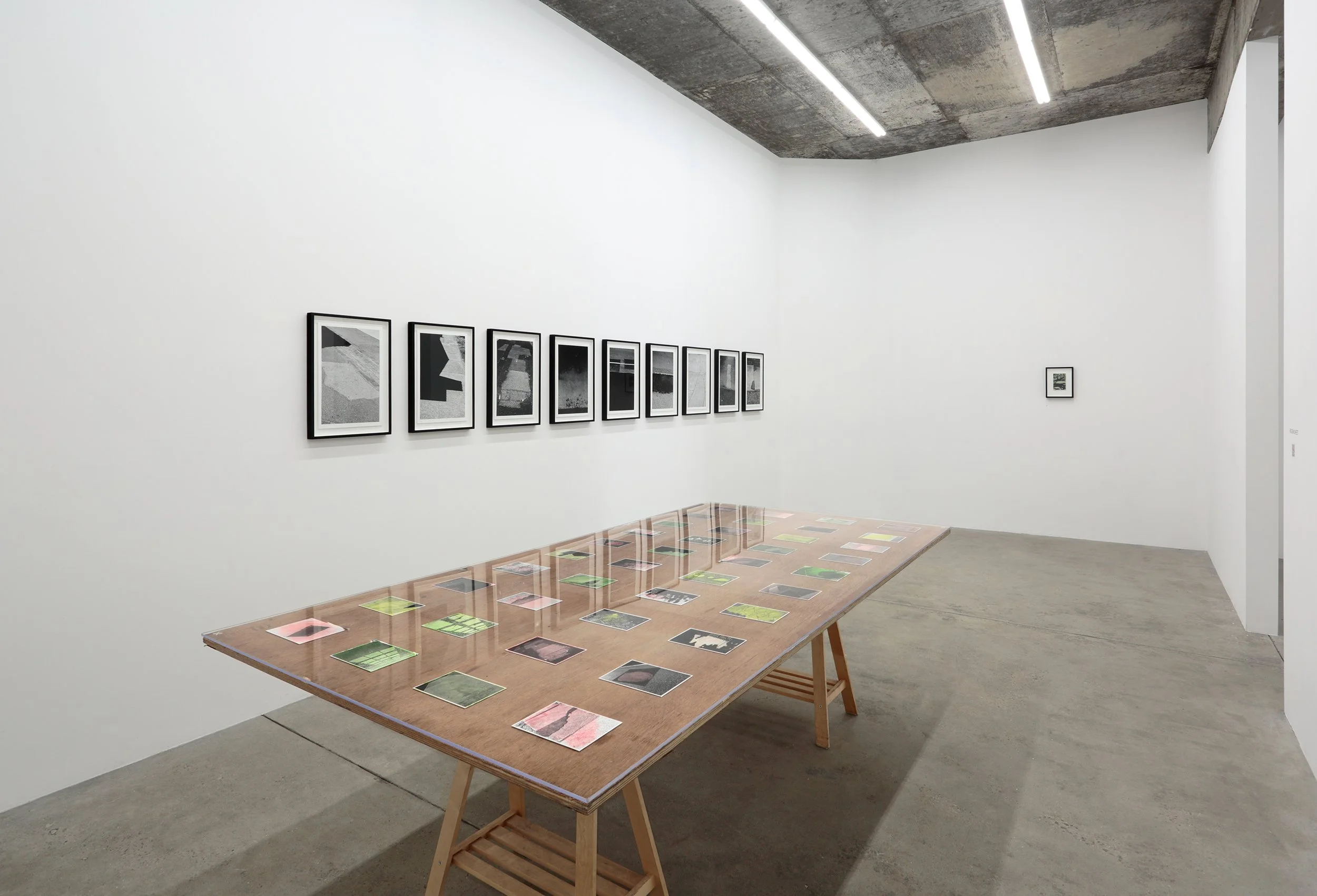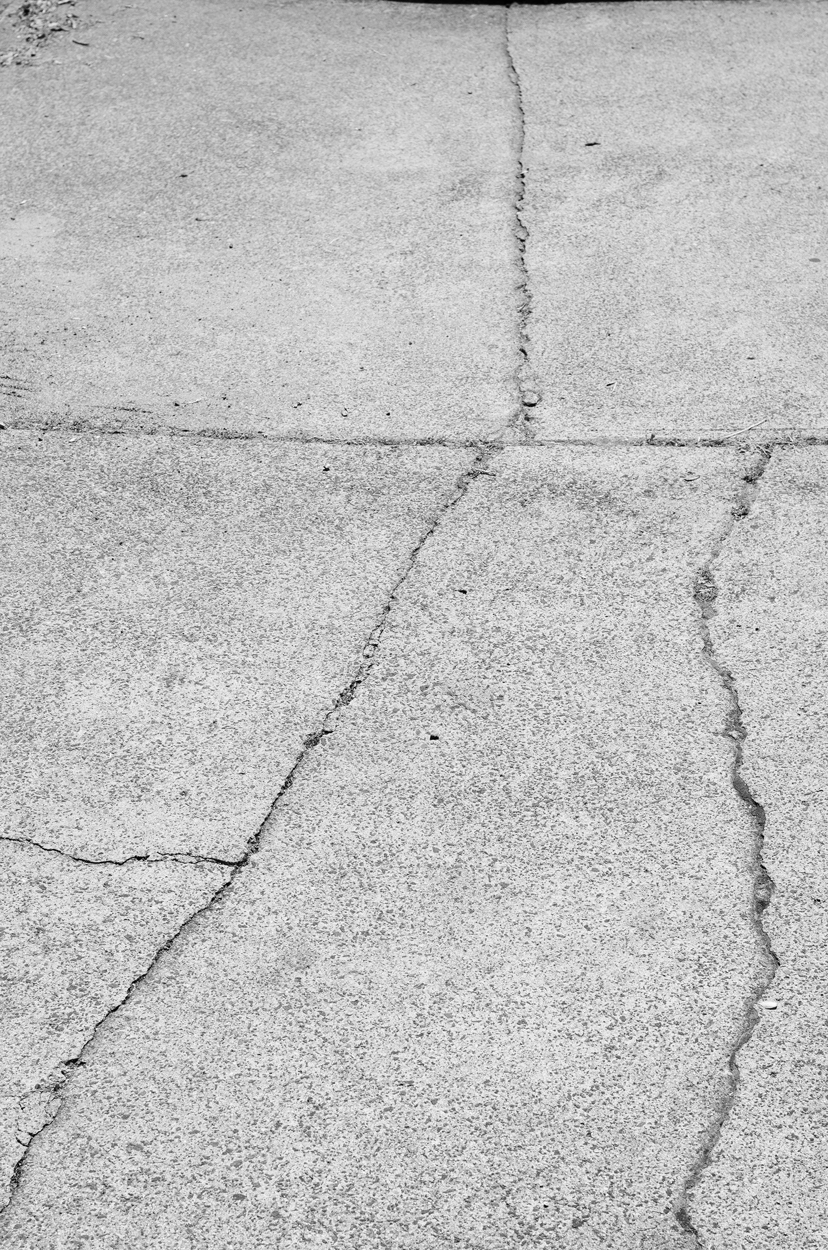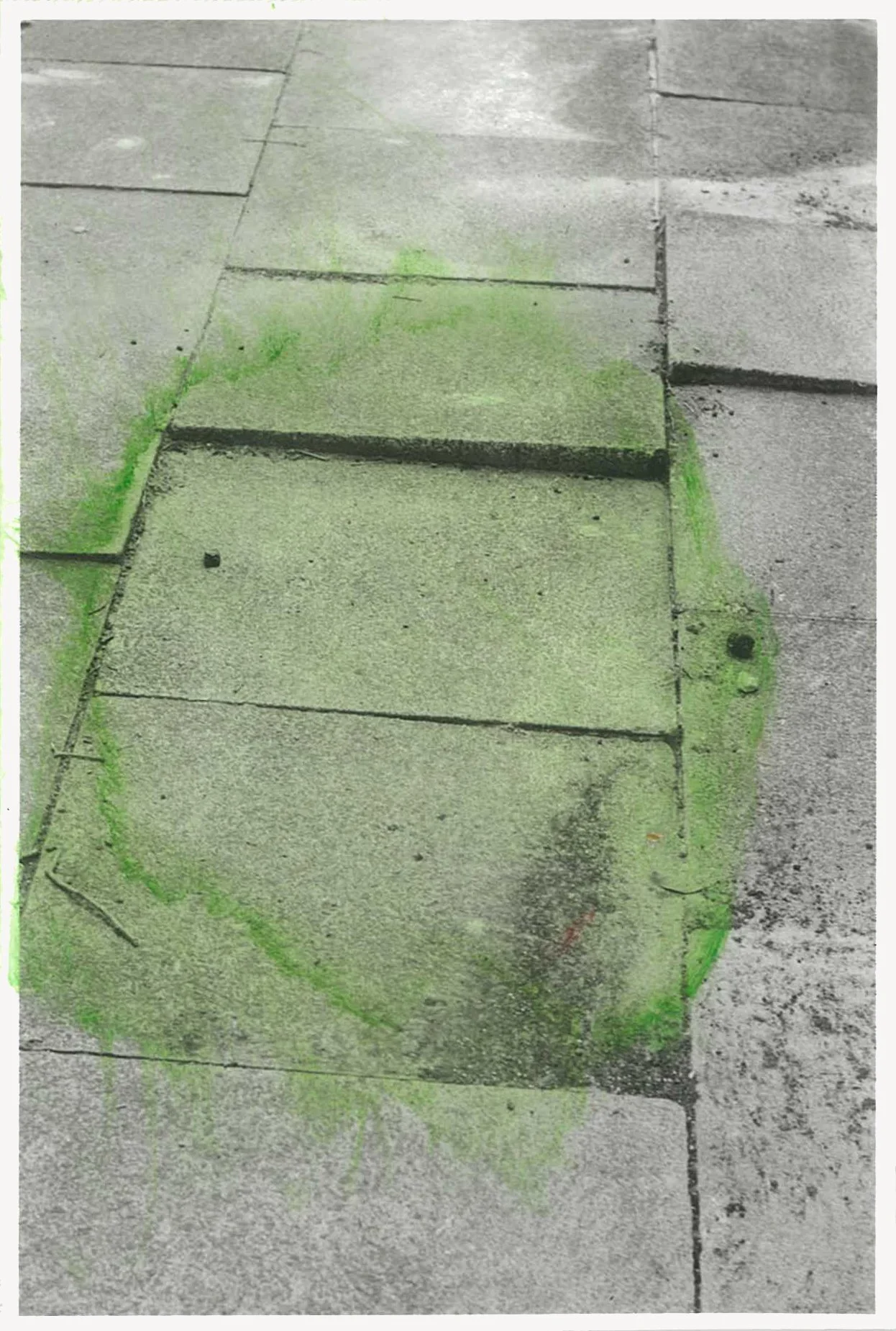The semi-abstracted photographs in Footpaths catalogue details of pedestrian walkways around Naarm/Melbourne. Seemingly ubiquitous, odd grids and lines of concrete, bitumen, gravel and bluestone are re-encountered and scrutinised as a taxonomy of highly nuanced variations of pattern, material and composition. The montage-like grouping of footpath details across both black and white and hand-coloured photographic prints accentuate encounters and phenomenological experience with details of the material world.