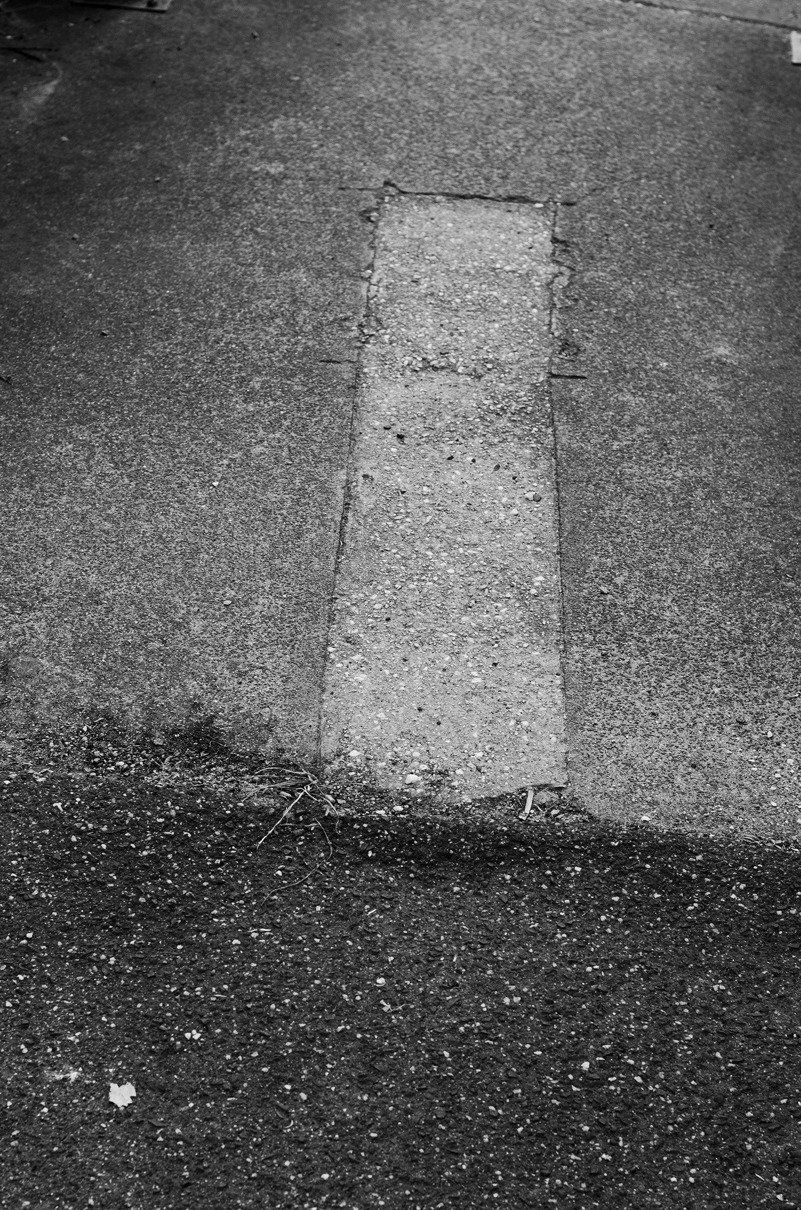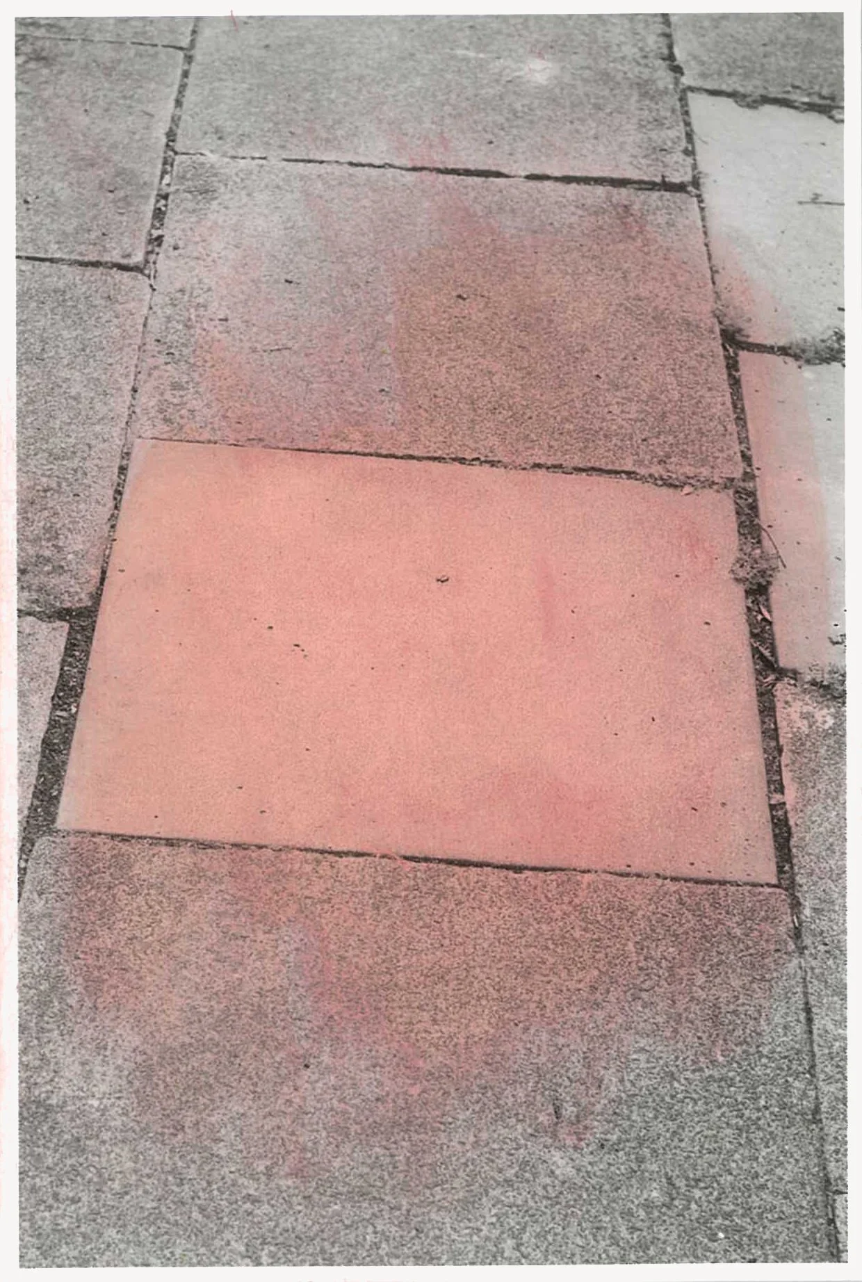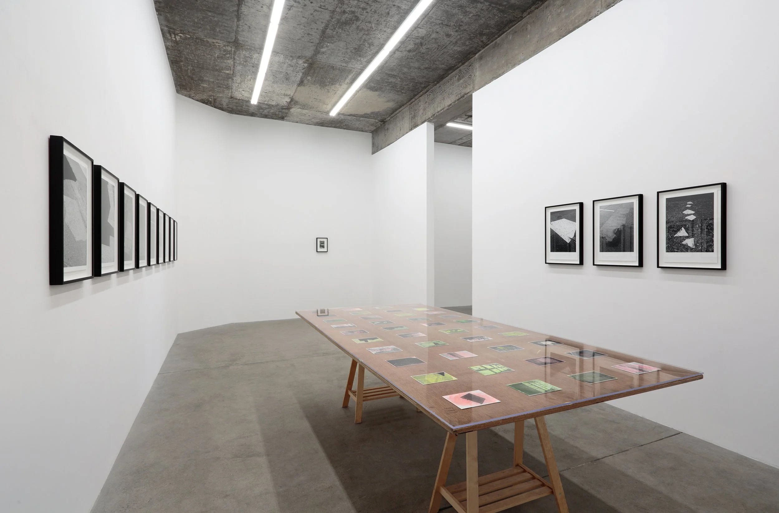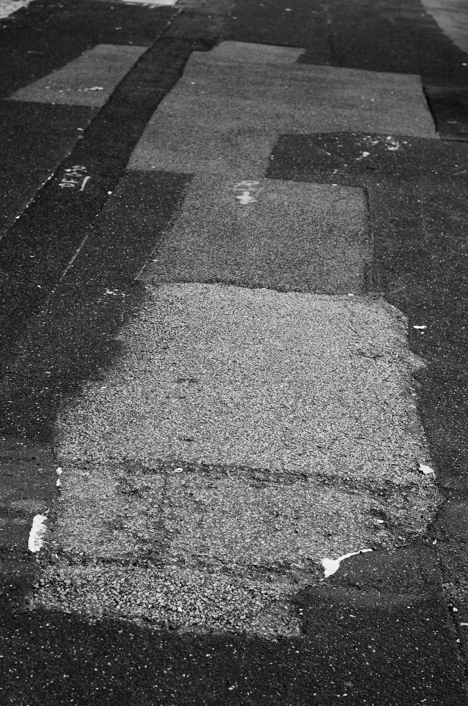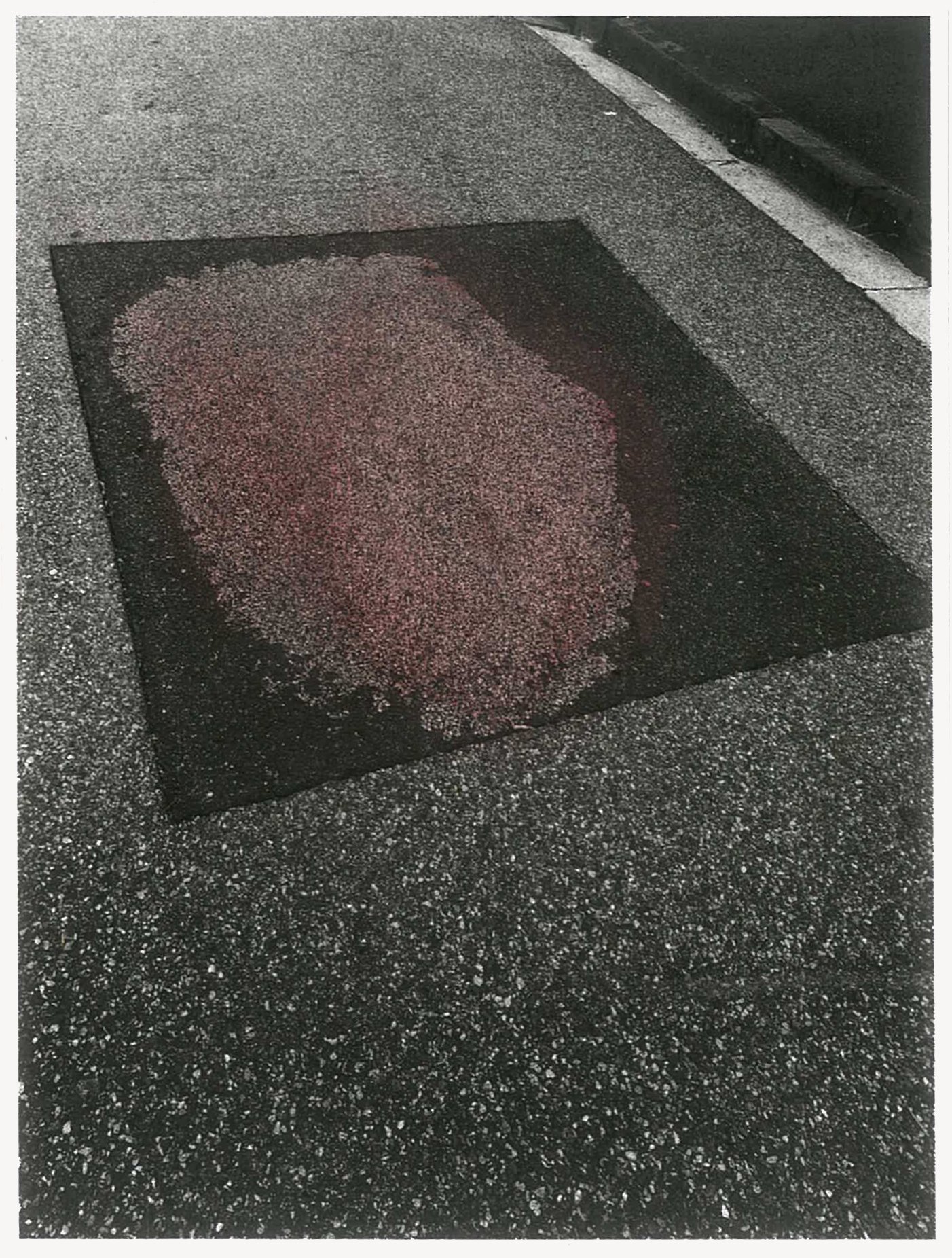 The semi-abstracted photographs in Footpaths catalogue details of pedestrian walkways around Naarm/Melbourne. Seemingly ubiquitous, odd grids and lines of concrete, bitumen, gravel and bluestone are re-encountered and scrutinised as a taxonomy of highly nuanced variations of pattern, material and composition. The montage-like grouping of footpath details across both black and white and hand-coloured photographic prints accentuate encounters and phenomenological experience with details of the material world.