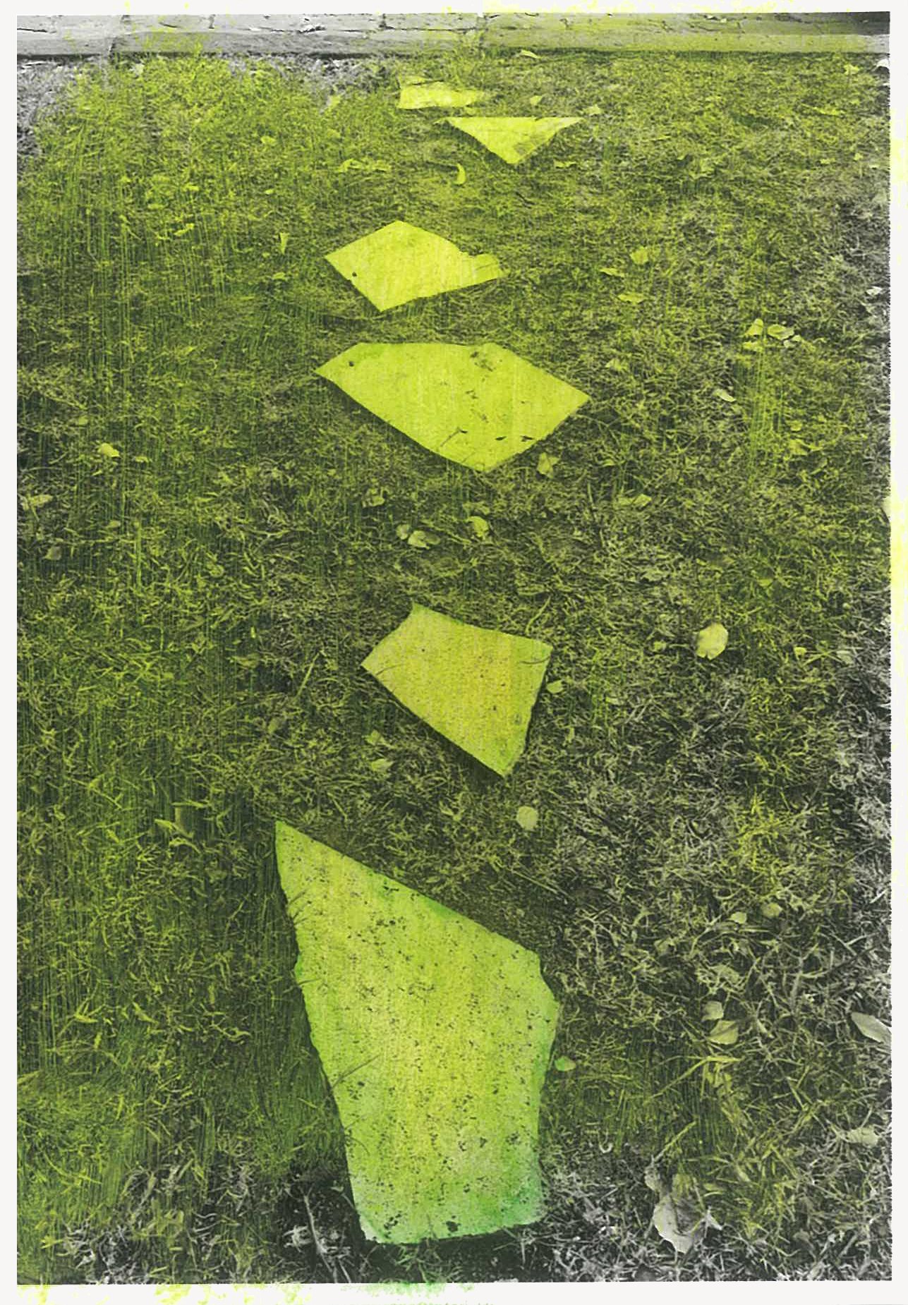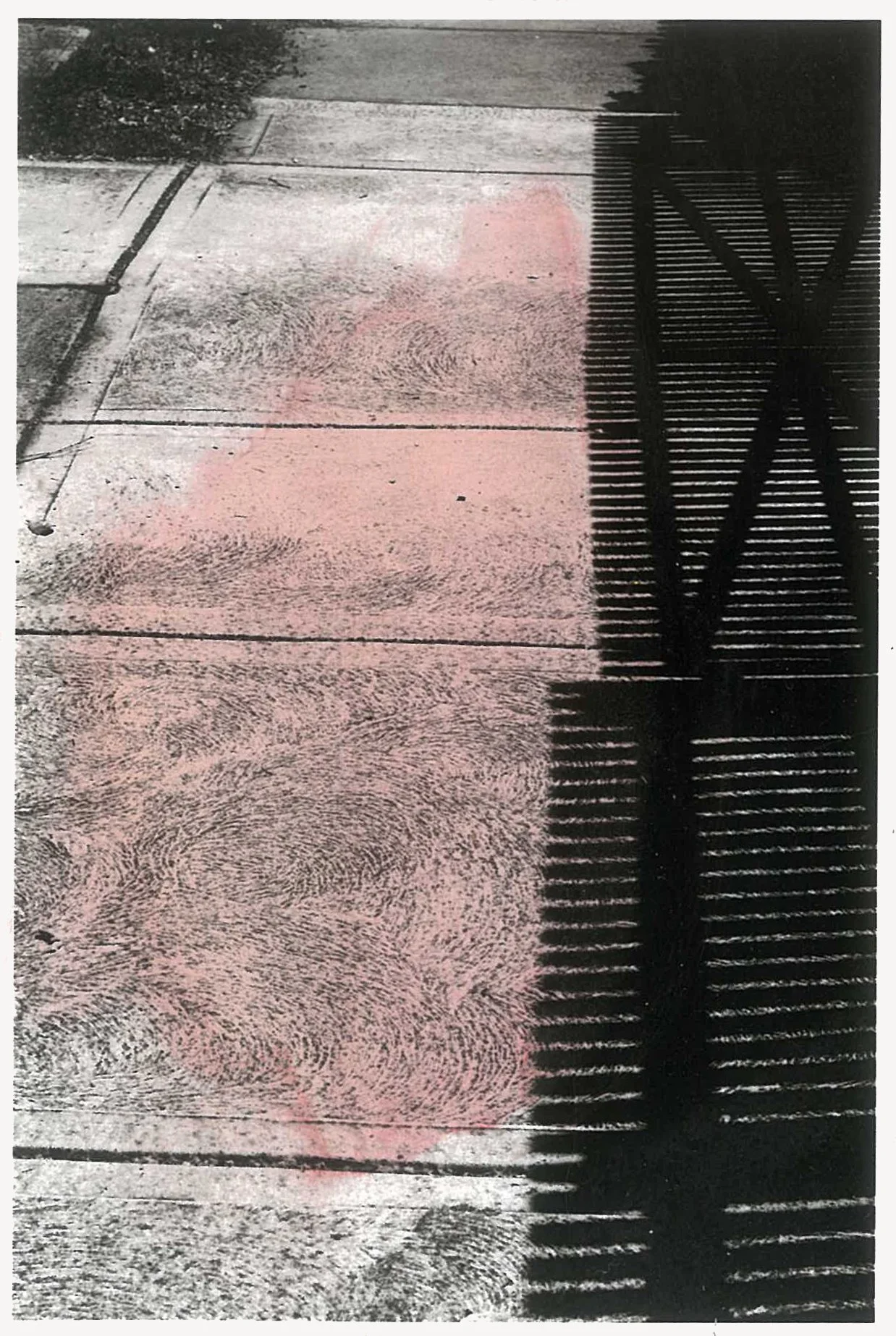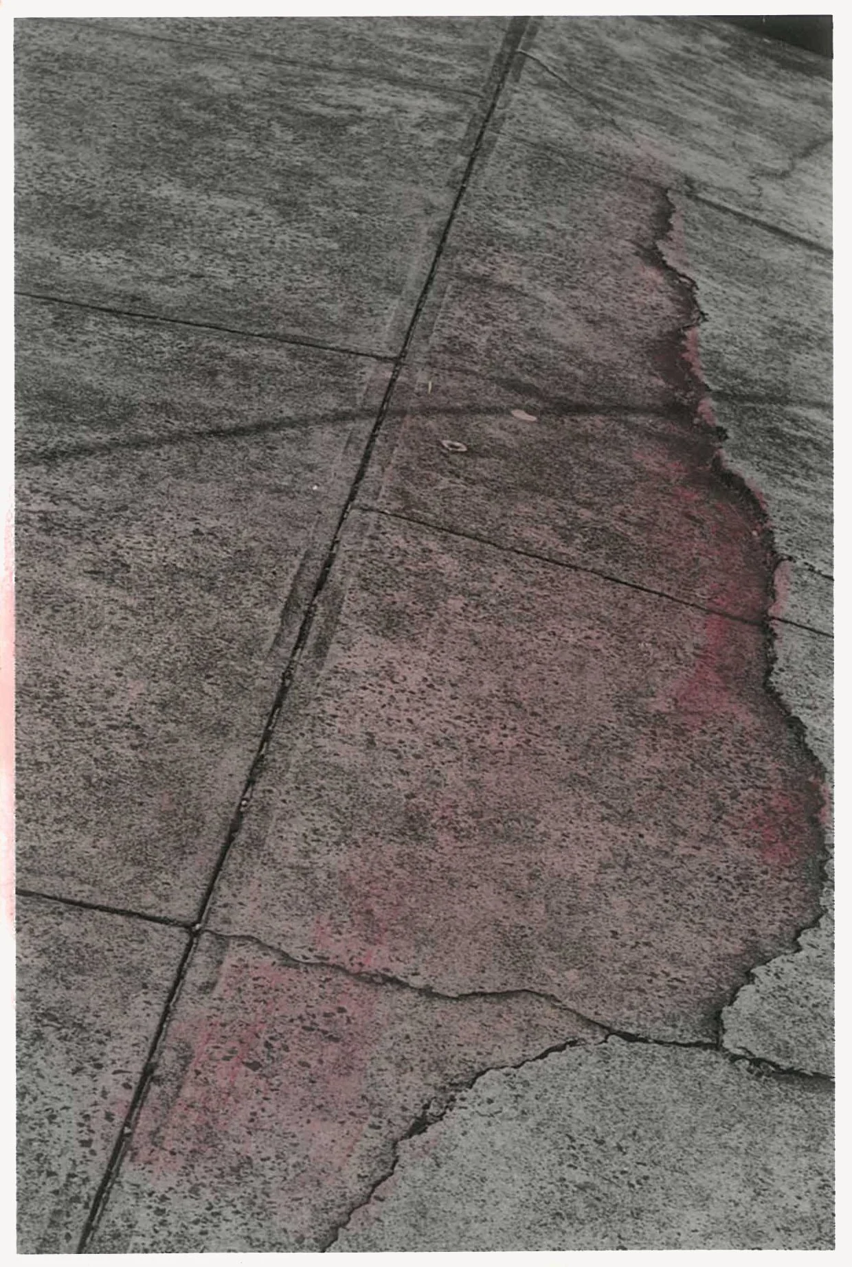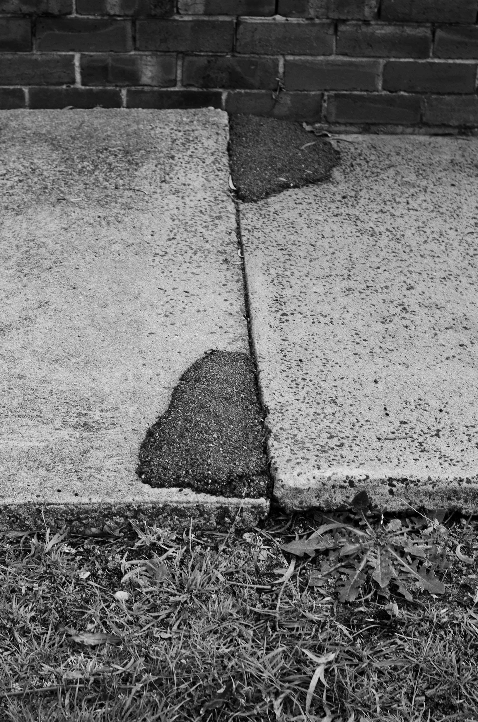 The semi-abstracted photographs in Footpaths catalogue details of pedestrian walkways around Naarm/Melbourne. Seemingly ubiquitous, odd grids and lines of concrete, bitumen, gravel and bluestone are re-encountered and scrutinised as a taxonomy of highly nuanced variations of pattern, material and composition. The montage-like grouping of footpath details across both black and white and hand-coloured photographic prints accentuate encounters and phenomenological experience with details of the material world.