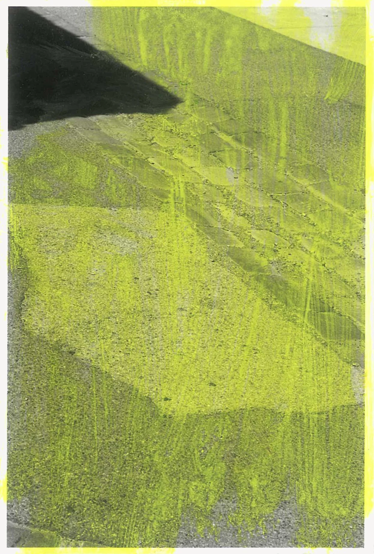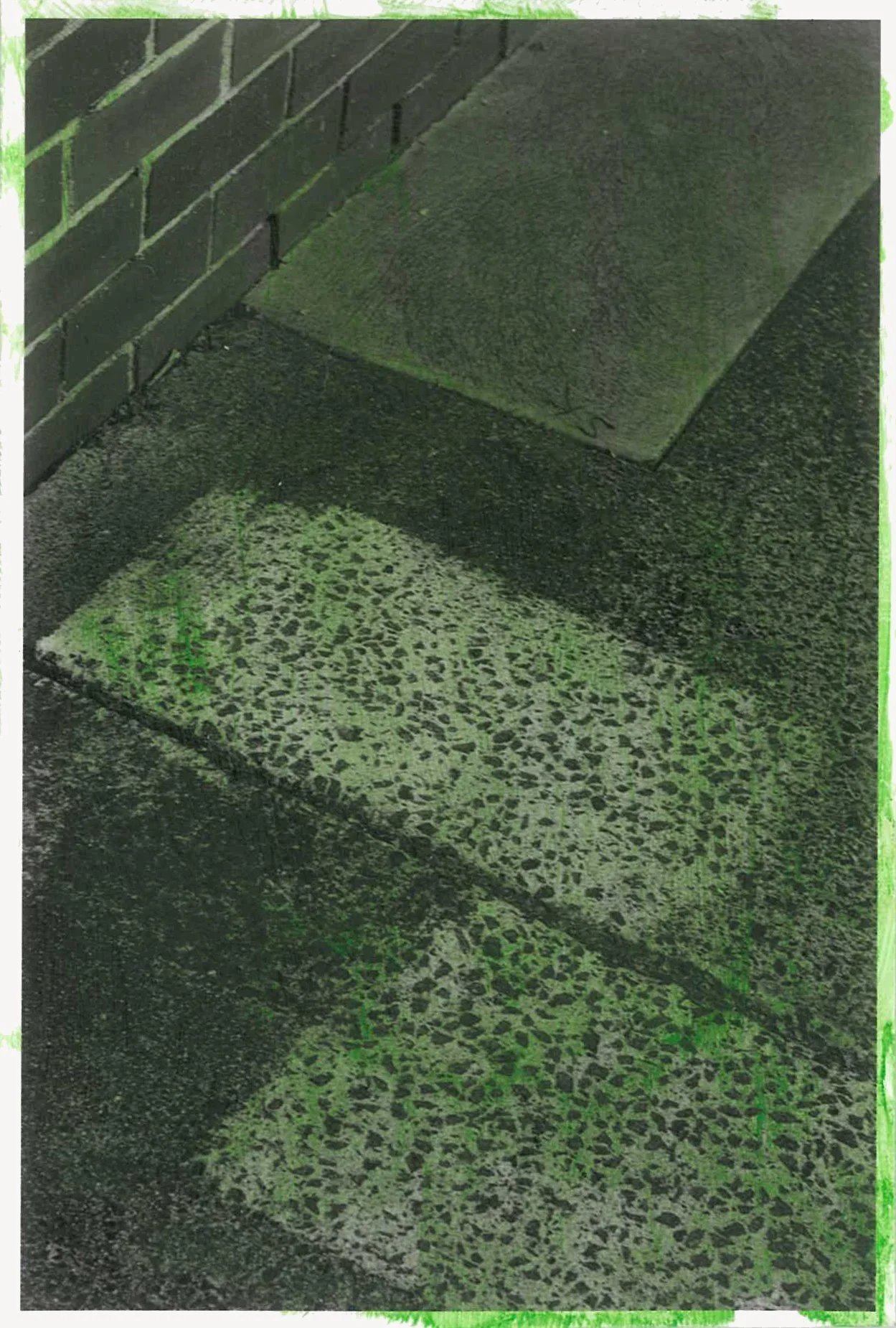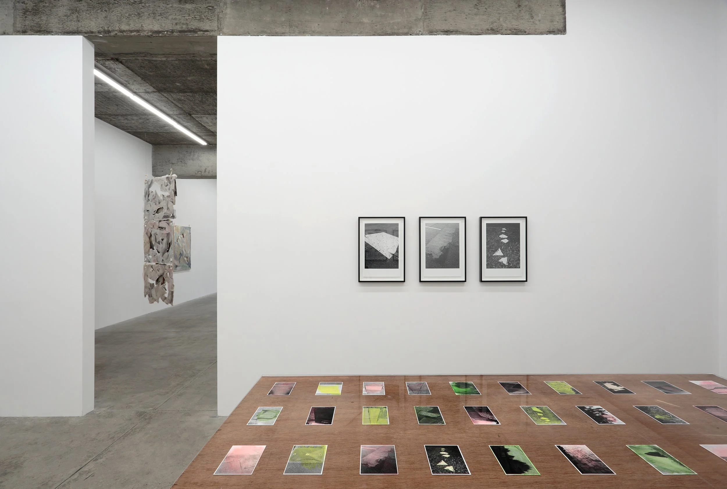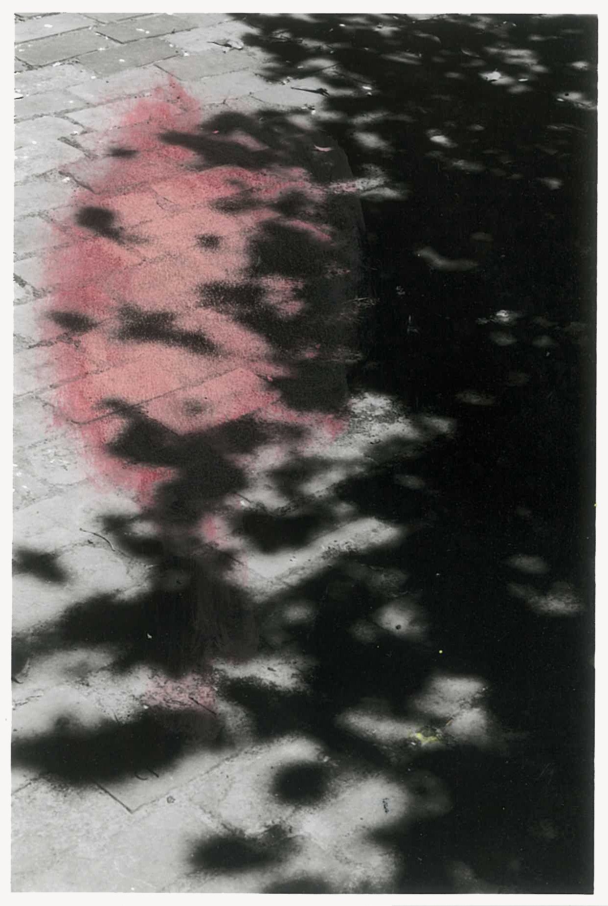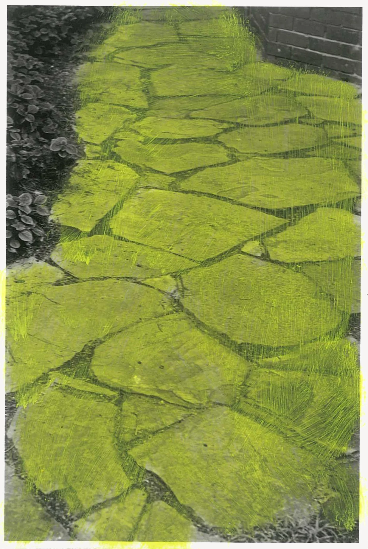 The semi-abstracted photographs in Footpaths catalogue details of pedestrian walkways around Naarm/Melbourne. Seemingly ubiquitous, odd grids and lines of concrete, bitumen, gravel and bluestone are re-encountered and scrutinised as a taxonomy of highly nuanced variations of pattern, material and composition. The montage-like grouping of footpath details across both black and white and hand-coloured photographic prints accentuate encounters and phenomenological experience with details of the material world.