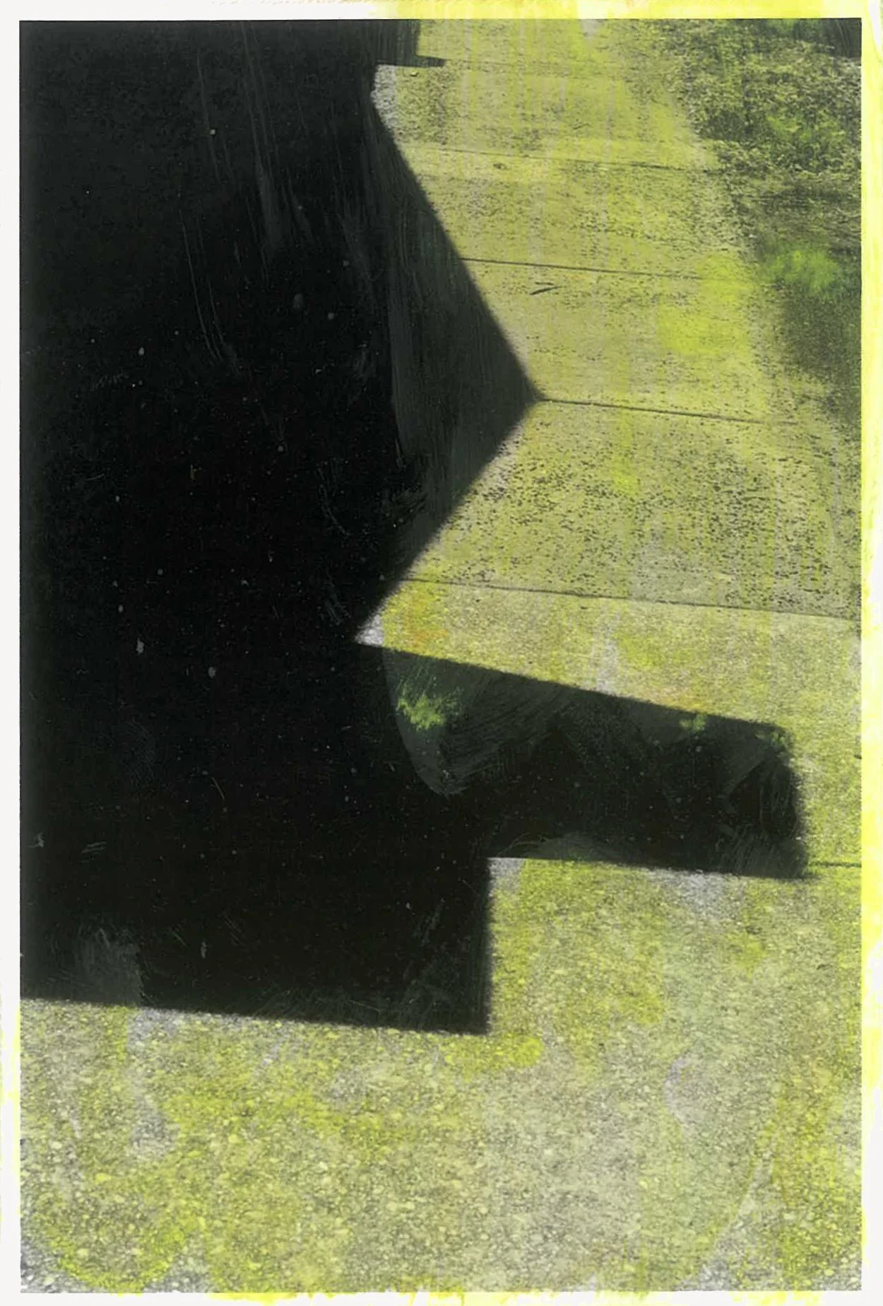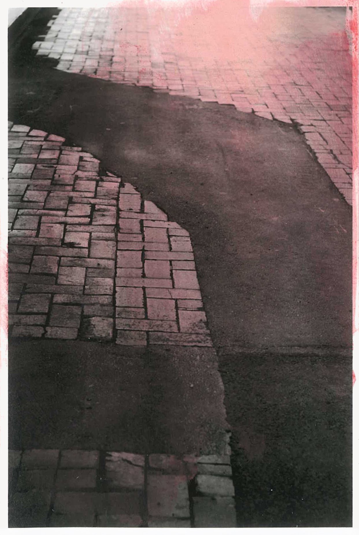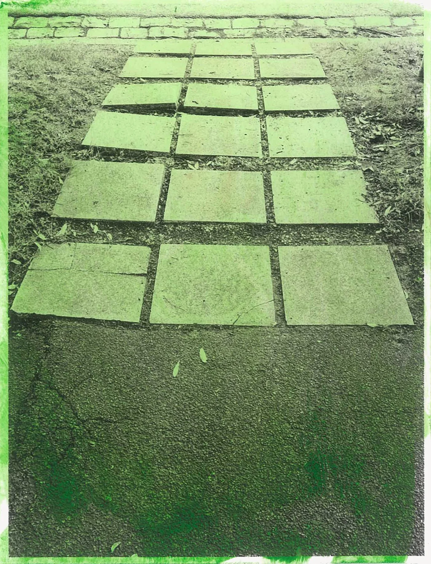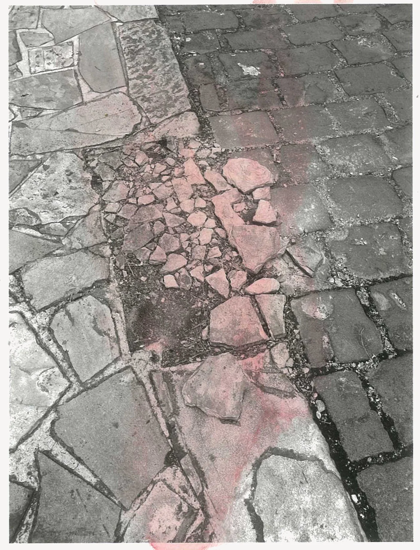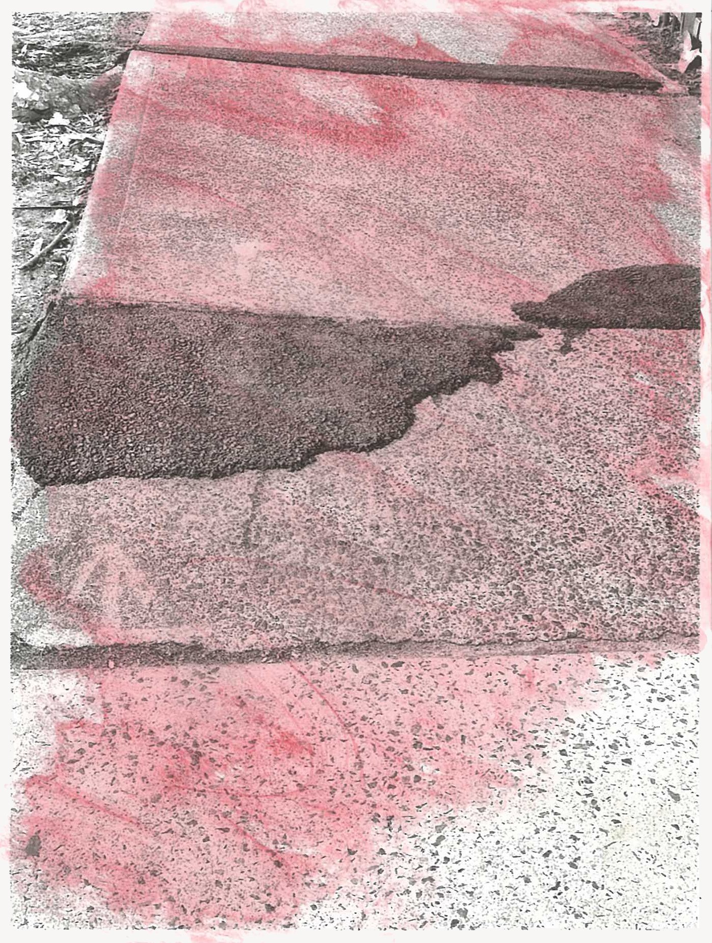 The semi-abstracted photographs in Footpaths catalogue details of pedestrian walkways around Naarm/Melbourne. Seemingly ubiquitous, odd grids and lines of concrete, bitumen, gravel and bluestone are re-encountered and scrutinised as a taxonomy of highly nuanced variations of pattern, material and composition. The montage-like grouping of footpath details across both black and white and hand-coloured photographic prints accentuate encounters and phenomenological experience with details of the material world.