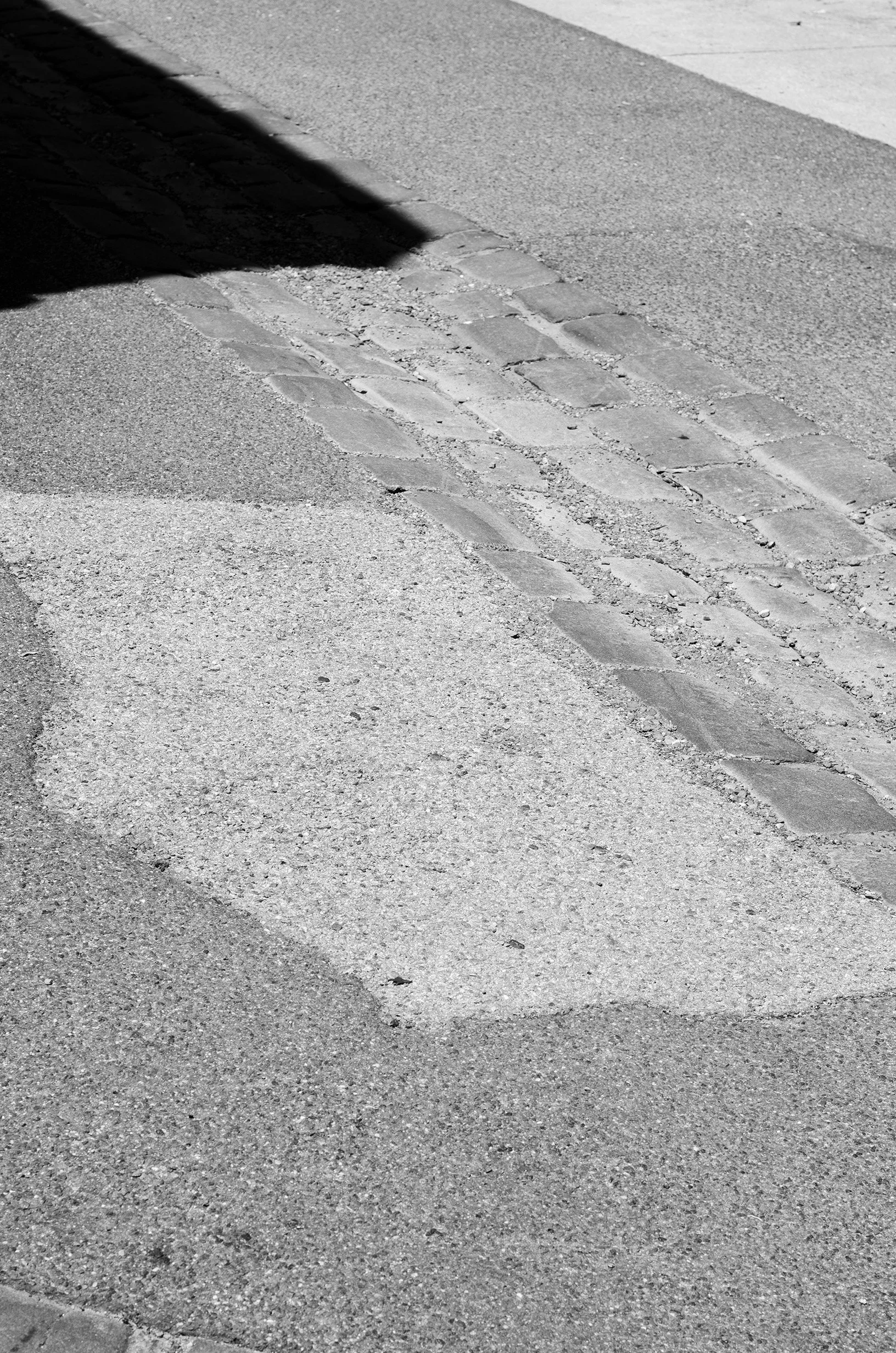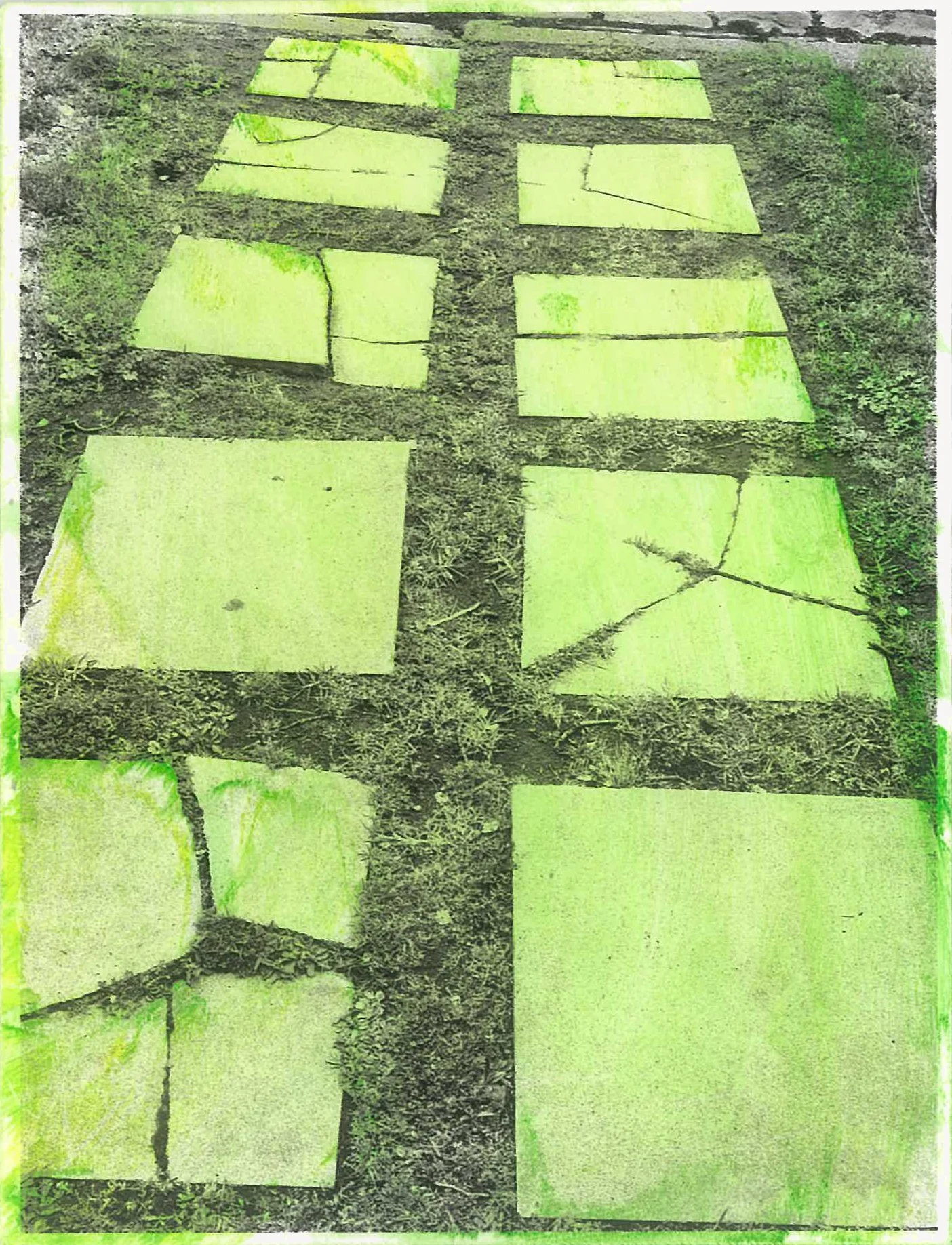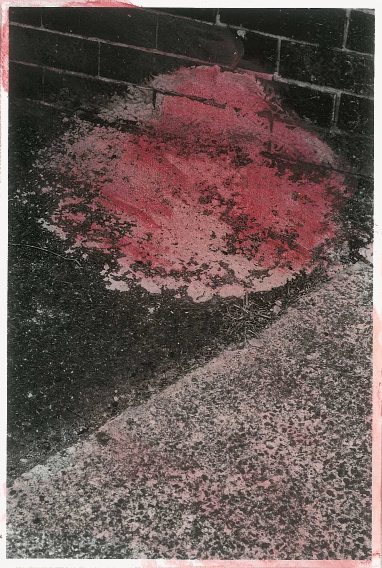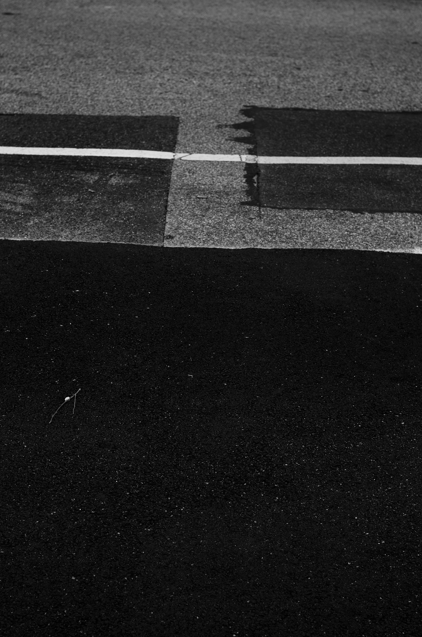 The semi-abstracted photographs in Footpaths catalogue details of pedestrian walkways around Naarm/Melbourne. Seemingly ubiquitous, odd grids and lines of concrete, bitumen, gravel and bluestone are re-encountered and scrutinised as a taxonomy of highly nuanced variations of pattern, material and composition. The montage-like grouping of footpath details across both black and white and hand-coloured photographic prints accentuate encounters and phenomenological experience with details of the material world.
