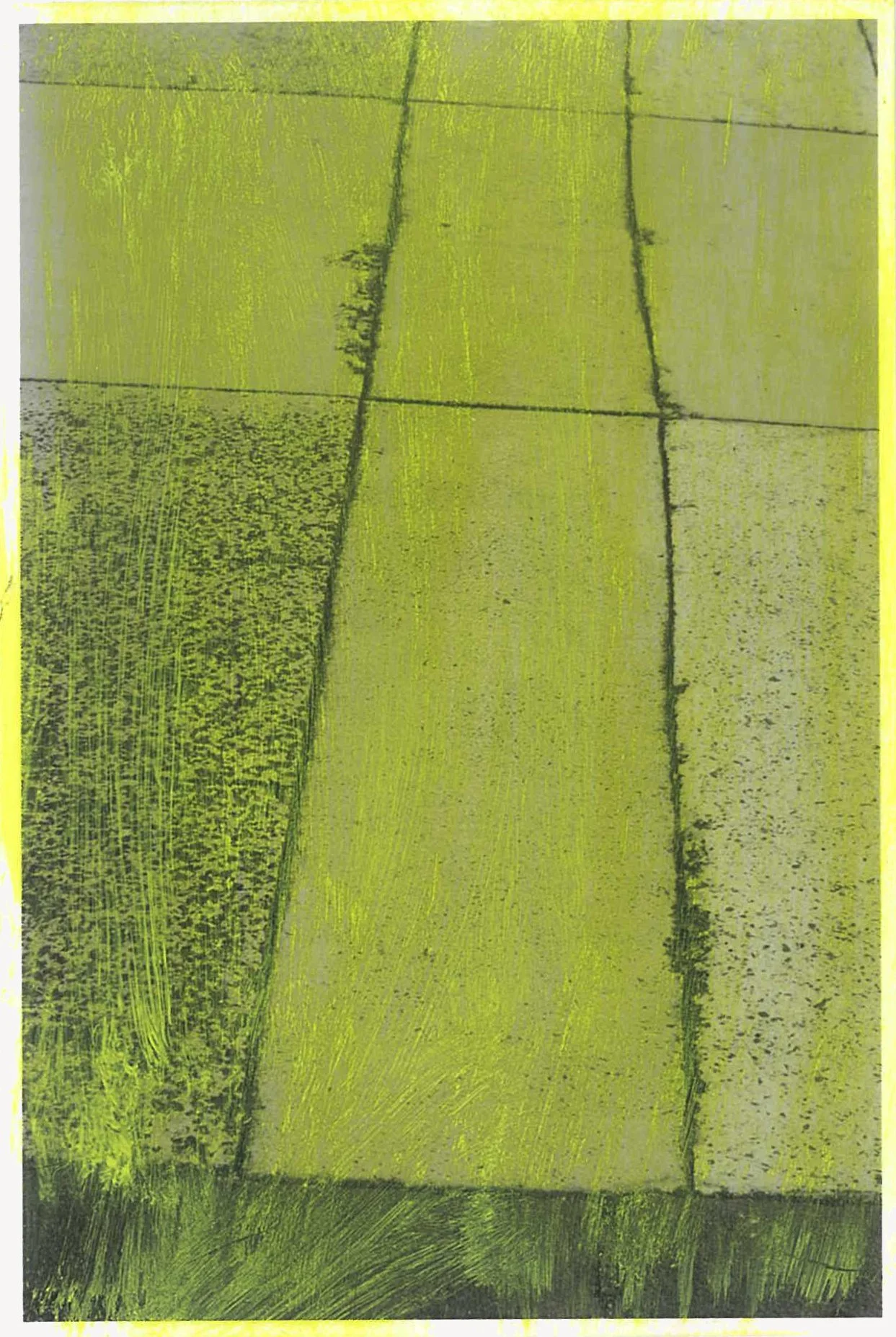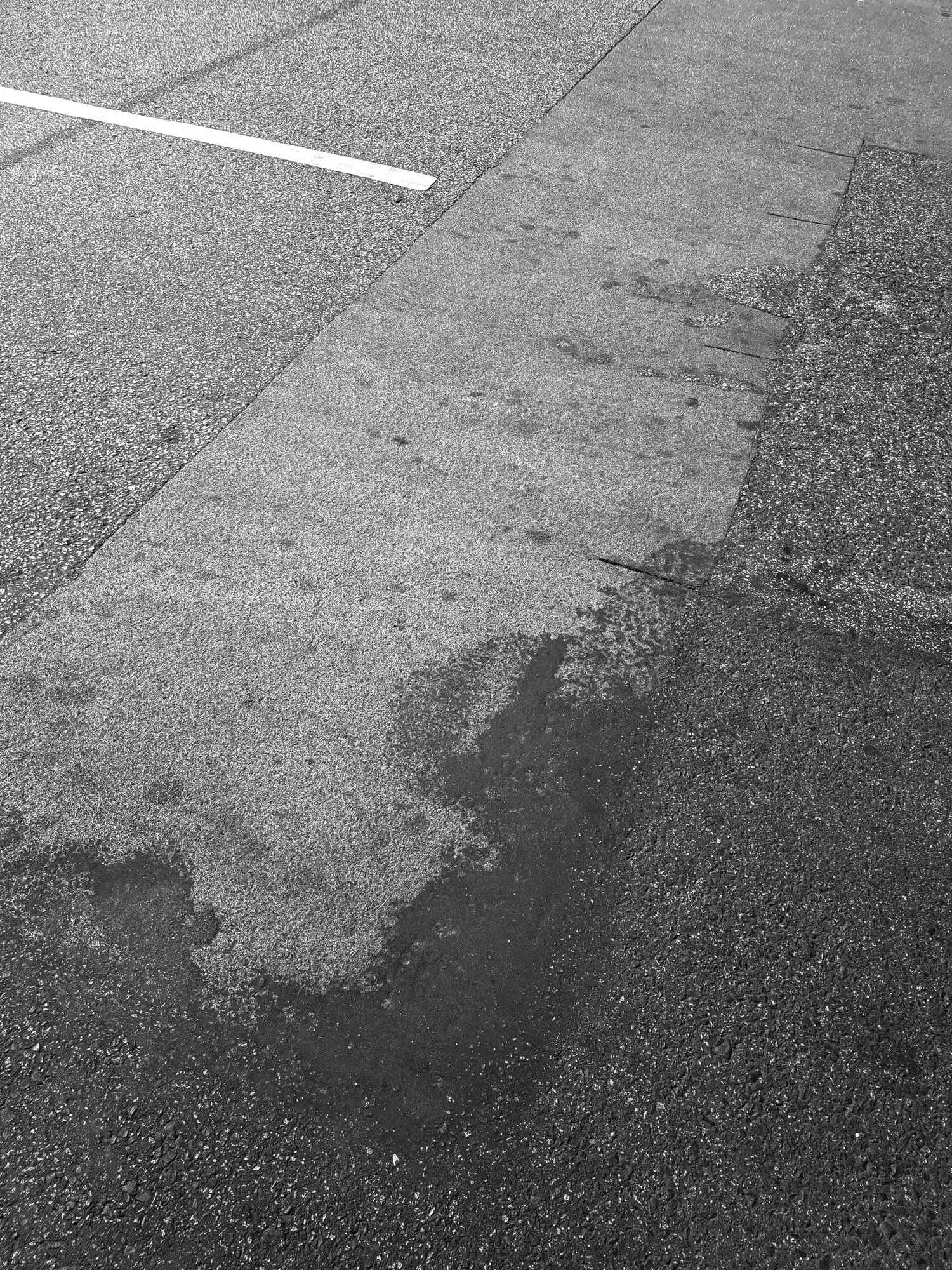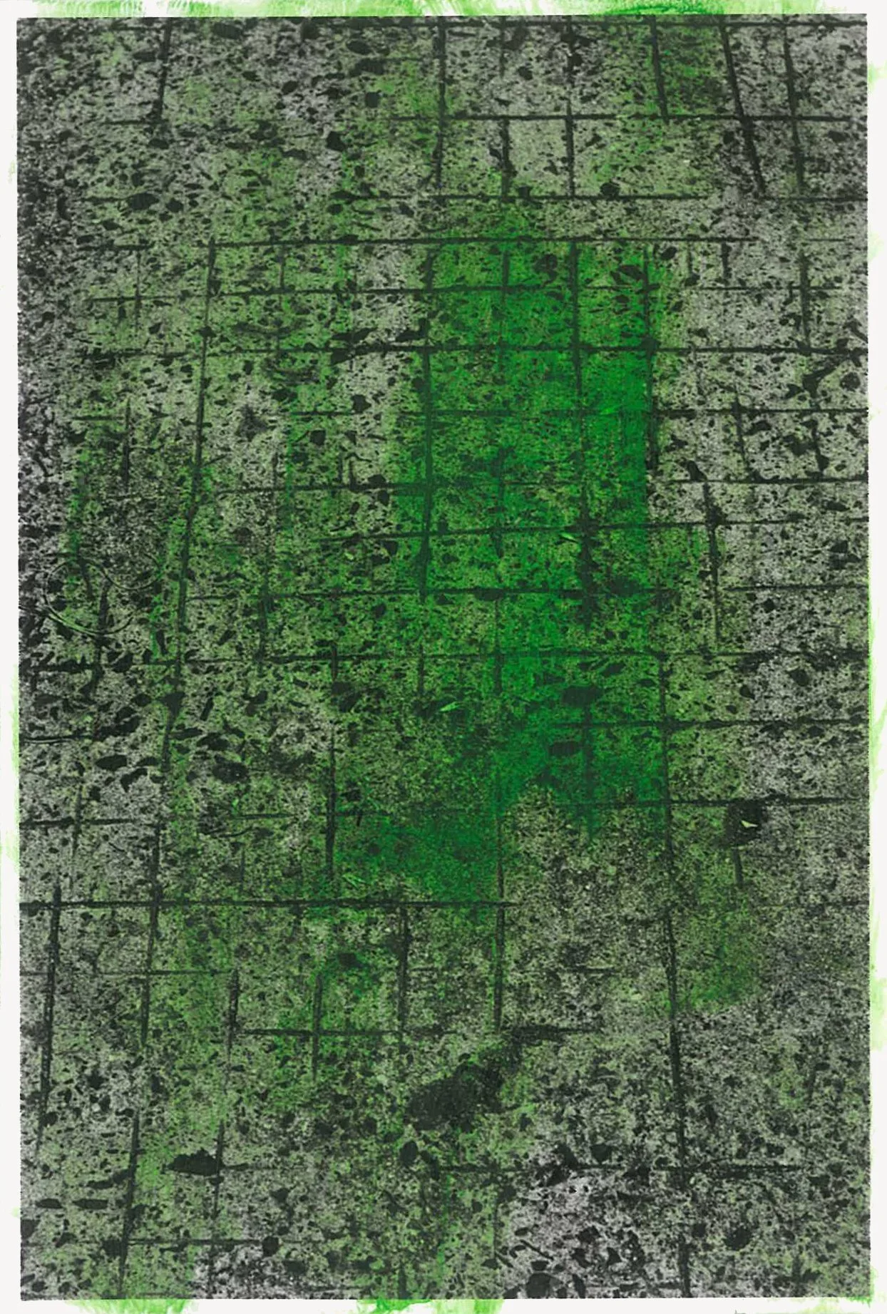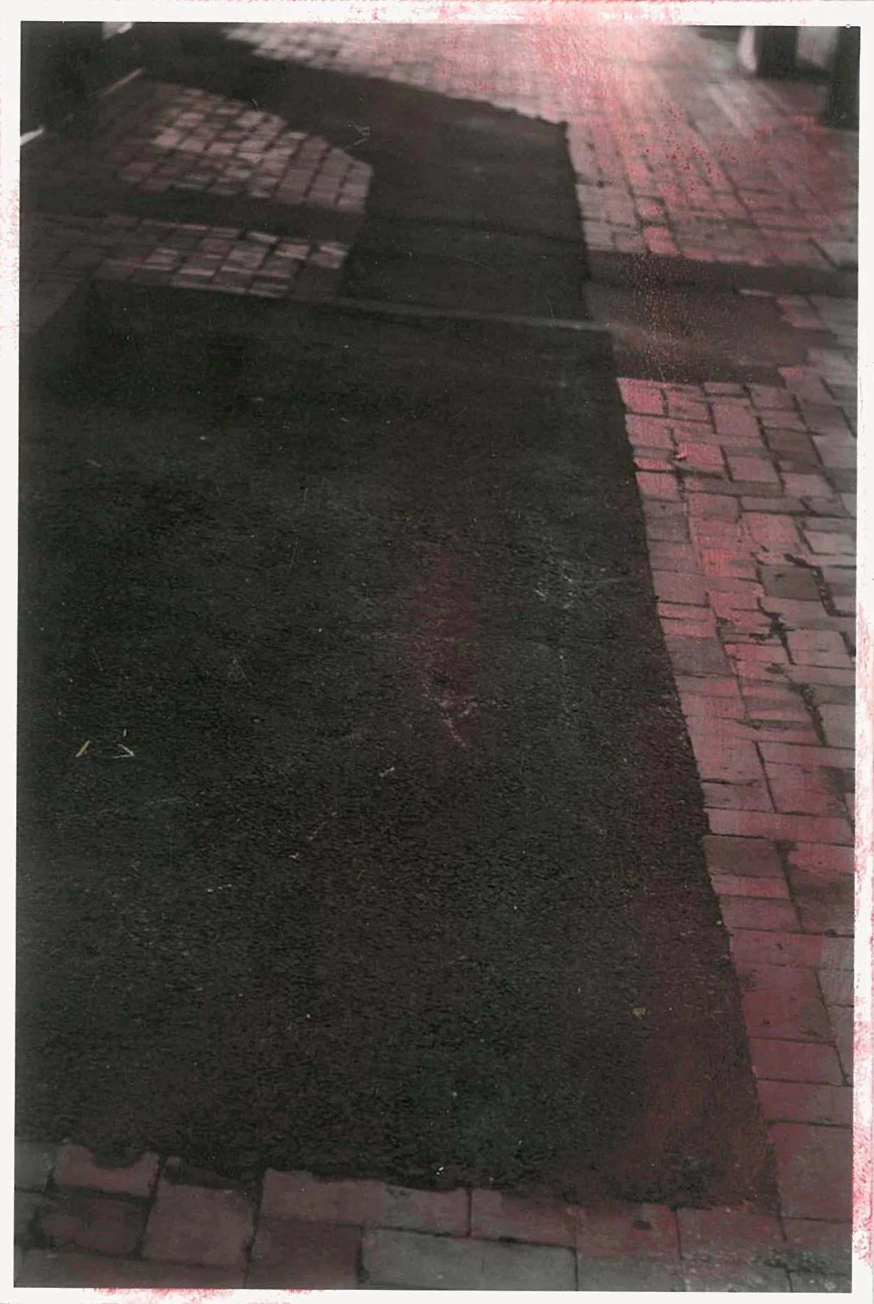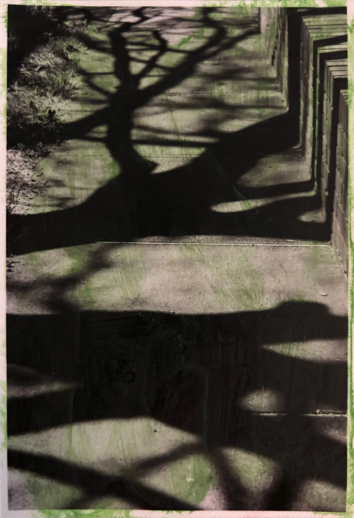 The semi-abstracted photographs in Footpaths catalogue details of pedestrian walkways around Naarm/Melbourne. Seemingly ubiquitous, odd grids and lines of concrete, bitumen, gravel and bluestone are re-encountered and scrutinised as a taxonomy of highly nuanced variations of pattern, material and composition. The montage-like grouping of footpath details across both black and white and hand-coloured photographic prints accentuate encounters and phenomenological experience with details of the material world.