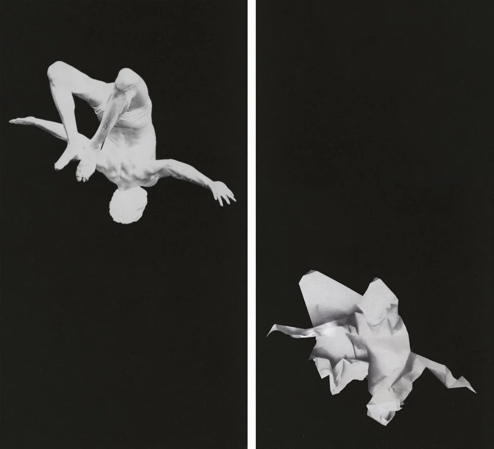 ‘Origami’ is a continuance across the diptych panel divide. I think of the use of staples in a chapbook by Cambridge poet JH Prynne working, in a way, as colons that we might read across. The natural descent of the flipping acrobat, dancer. The Muybridge like experiment in observing movement. The first plate of the ‘person’ that has been set as plaster, with human tissue and clothing intact as ‘real’, but made into a form as if by metamorphosis. Already in that one image we have the human becoming non-human and vice versa, the life in the movement and the question of what will become of that caught/stilled movement. We cross and descend to a paper fabrication... an approximation of the figure in the next stage of the lateral drift, of the displaced physics and physiology. With the nuances of shading against the darkness, the plaster-white paper, the bleached paper, becomes uncannily more human than the original figure — one and the same but almost in ways we might not expect. To shape the paper, to fold and bend, to make it enact, to mimic, but to hold its own latent energy, its own tensions. This is what I would call a de-mapping.