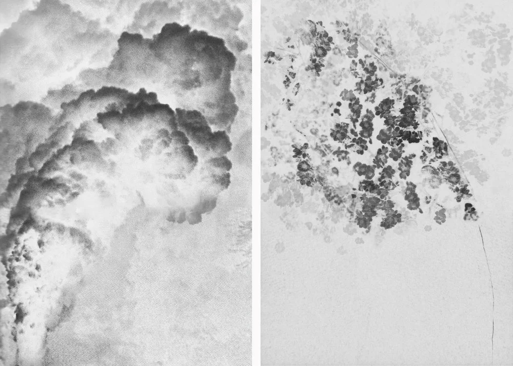 I will finish with a poem as response to ‘Bloom’ (screenprint on aluminium) which is the way I best know how to unprocess the processed. This is relevant to me personally because I campaign against the destruction of the Western Australian jarrah forests and aluminium in the consequence of bauxite mining. I call it a ‘false shine’ and Zoë Croggon’s ‘Bloom’ so beautifully expresses an irony of materials and similarity, of analogy and simile, and ultimately of metaphor’s place in visual art. The bloom on the left side of the brain of the diptych (perversely, the reasoning language side — capitalism knows its stuff) seems a toxic cloud of industrial exhaust, the artificial ‘clouds’ of a carbon-spewing smokestack (such toxicity often carries a sublime ‘beauty’), while on the right side of the brain (creativity... you know the drill) the delicate flower print that fades in and out of definition (with another sort of sublimity in its bold vulnerability). They bind towards each other in Rorschach test mimicry, with a deadly eschatological urgency... bent by the will to pattern and ‘completion’. This grim, pessimistic masterpiece of irony extends all the way (to my mind) to the ‘geographical’ and ‘geological’ source of the corruption: the industry that kills country and the biosphere. Croggon knows the costs of making art so will make that art work to contest the wrongs. A minimal impact for maximum correction is the desire. It’s a desire worth considering in all its implications.