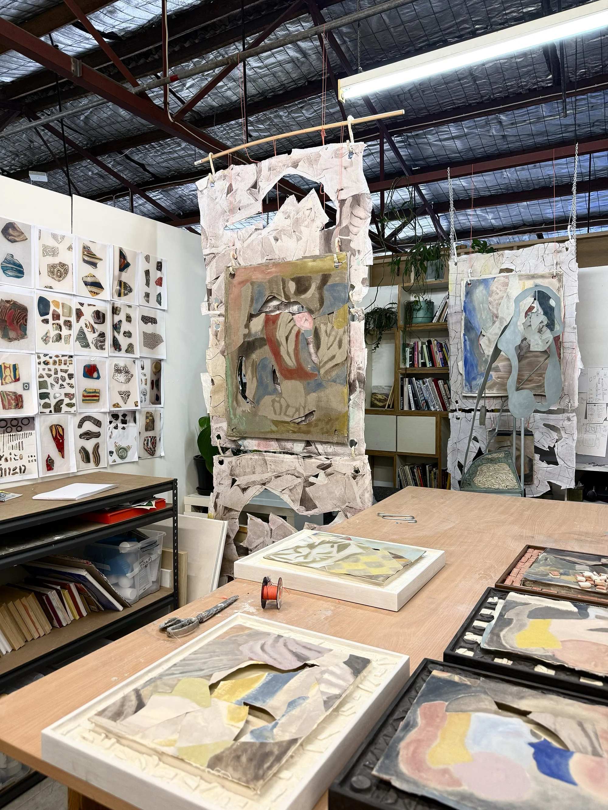 The same could be said for Kate Tucker’s work. Our own ‘imaginal adventure’ begins with the works’ borders, liminal zones demarcated by braided linen, ceramic, steel or welded supports. But these are not the true edge. In blurring the boundaries of her mediums, Tucker extracts the centre of a work and pushes it towards the margins, bringing the real edges—the disjointed spaces between cut linen, the lines of grout surrounding a glazed tile, the void created by layered canvas—towards the heart of the work.